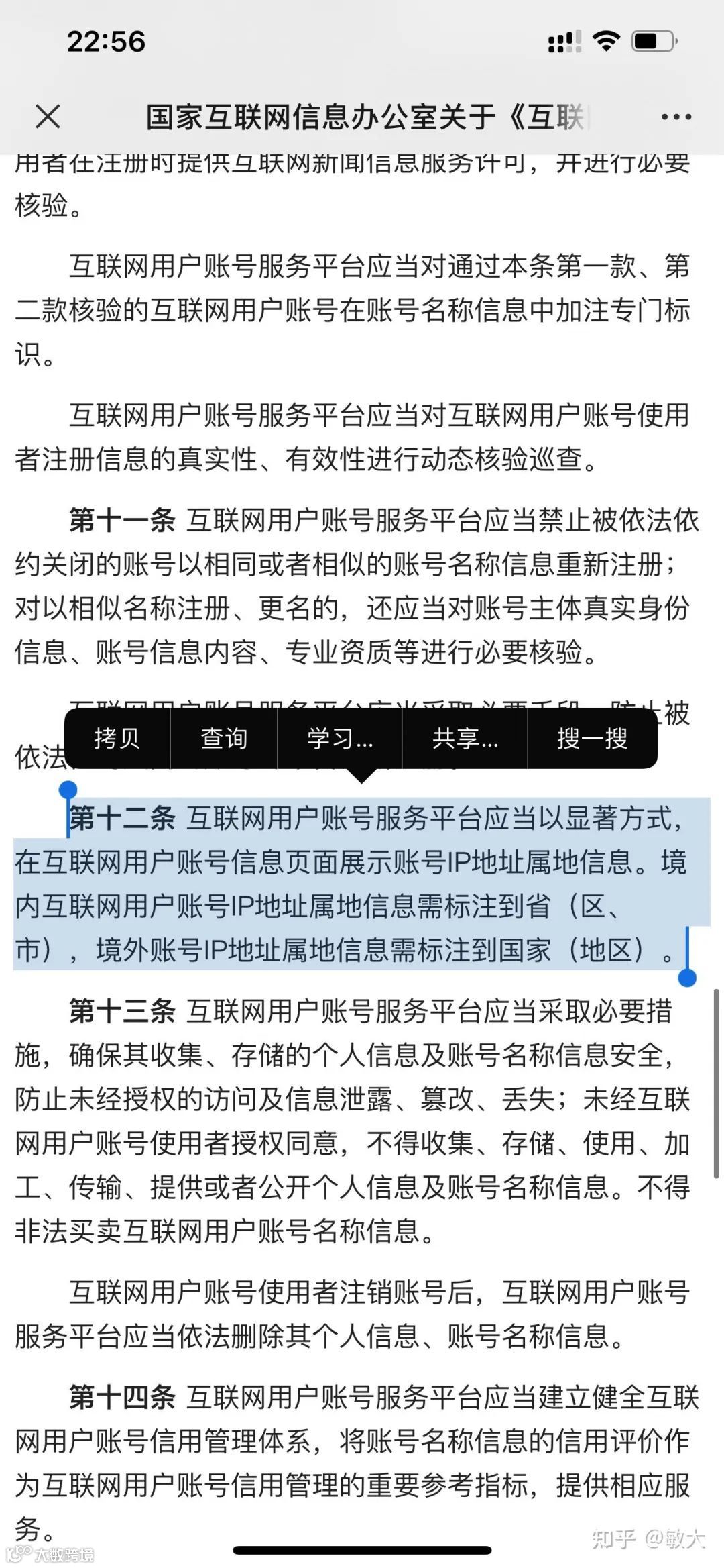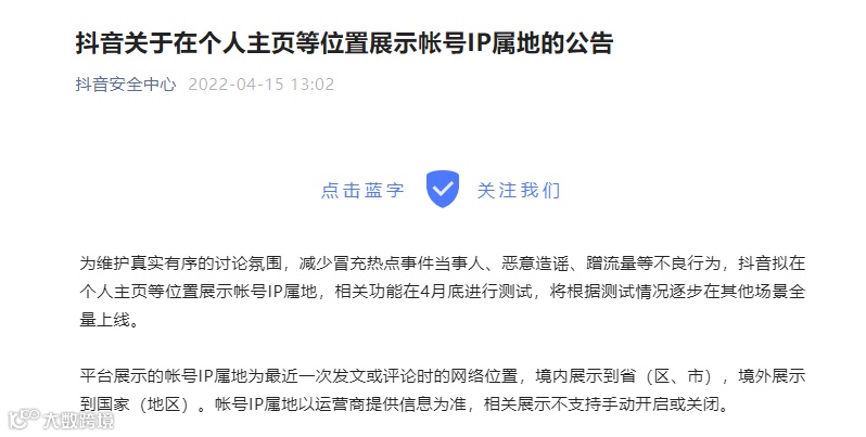 除此之外,国家互联网信息办公室之前也发布了关于《互联网用户账号名称信息管理规定(征求意见稿)》 ,其中有一条规定称“互联网用户账号服务平台应当以显著方式,在互联网用户账号信息页面展示账号IP地址属地信息。境内互联网用户账号IP地址属地信息需标注到省(区、市),境外账号IP地址属地信息需标注到国家(地区)。”