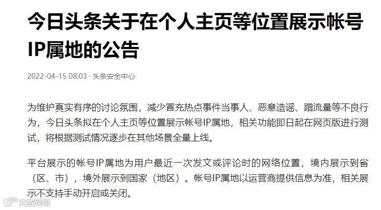 除了微博,今日头条、抖音、知乎、小红书等平台也纷纷宣布将上线显示“IP属地”功能,用户在发送内容或发表评论时,都会展示你的IP属地。