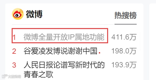 #微博全量开放IP属地功能#消息公布后迅速登上微博热搜第一。