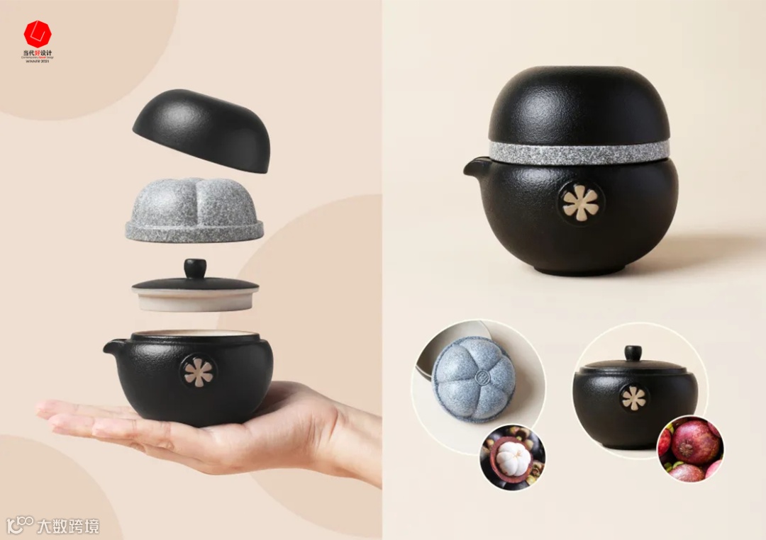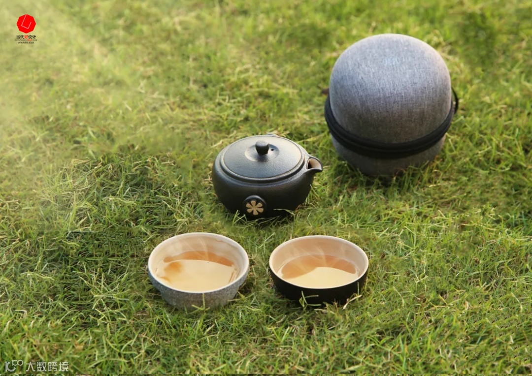 知足常乐旅行组是以户外轻简品茗为发想设计的便携茶具,整体造型像一颗山竹。壶把描绘山竹蒂瓣纹理,起到隔热防烫的效果。整套采用创意组合式结构,壶杯可套叠一体,尽可能地减小茶具占据的空间。搭配便携包,只需四步就能快速完成收纳,解决外出时的饮茶难题。精神层面则借用“竹”与“足”的谐音,传达知足常乐,乐在茶中的生活理念。