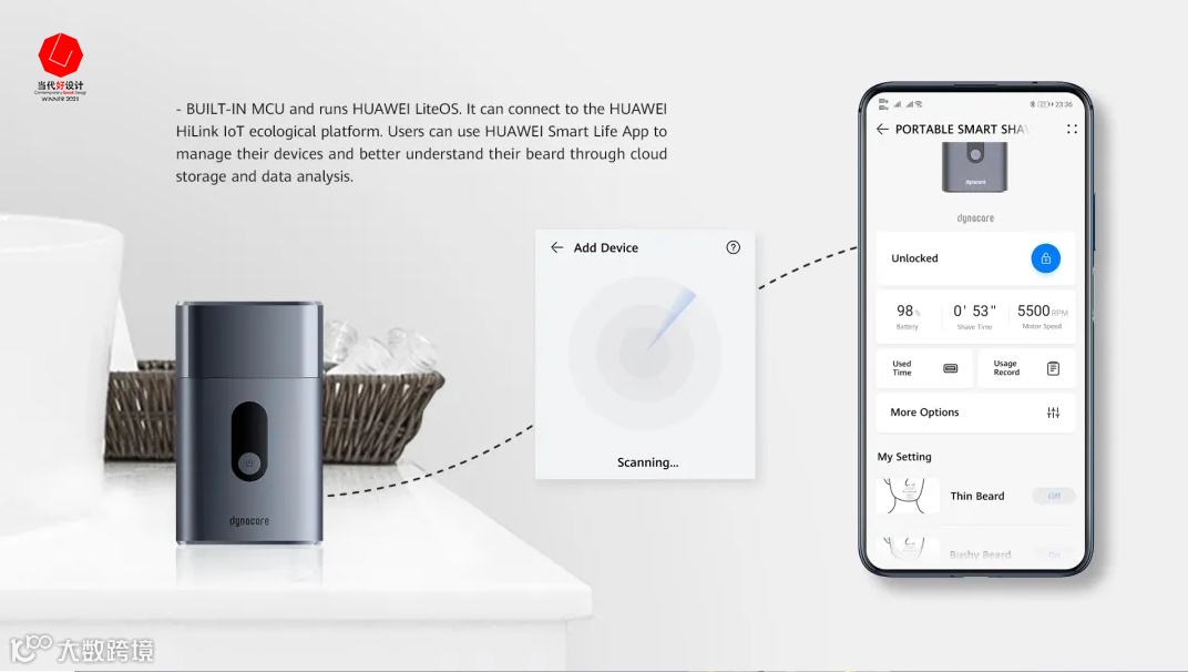 这是一款全新的智能便携剃须产品,专为追求品质生活的男性设计。除了方便携带的卡片式设计外,它拥有很强的剃须能力,还内置物联网智慧芯片,可用App设置个性化的剃须模式,实现了剃须刀的人机交互。