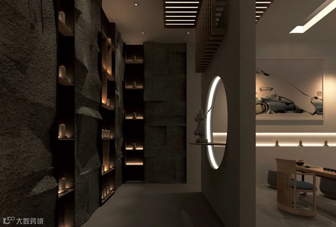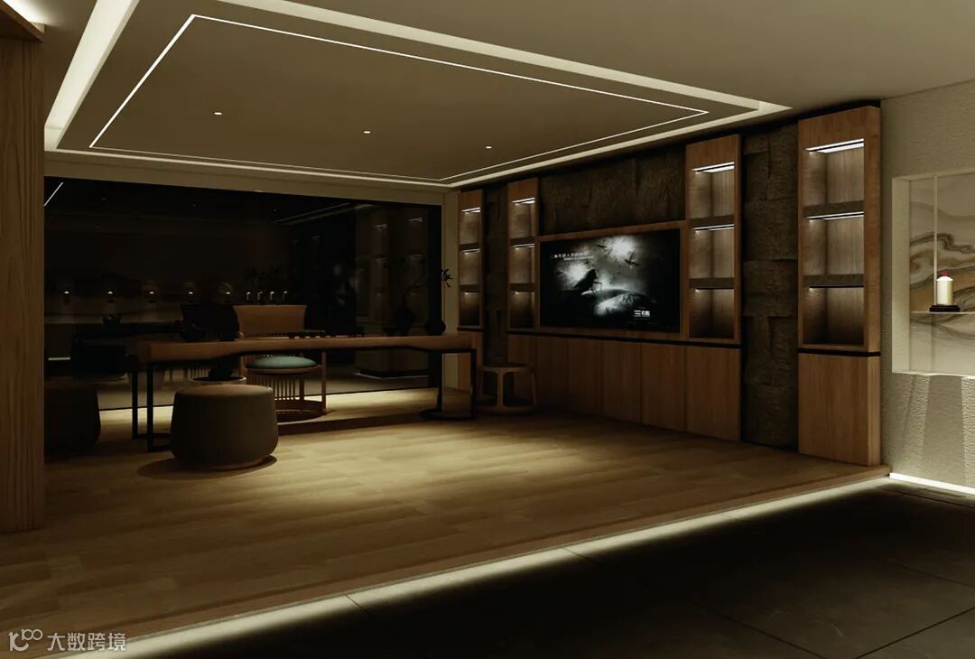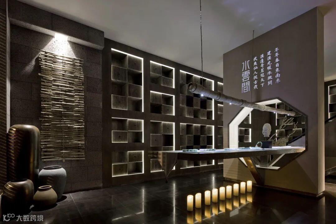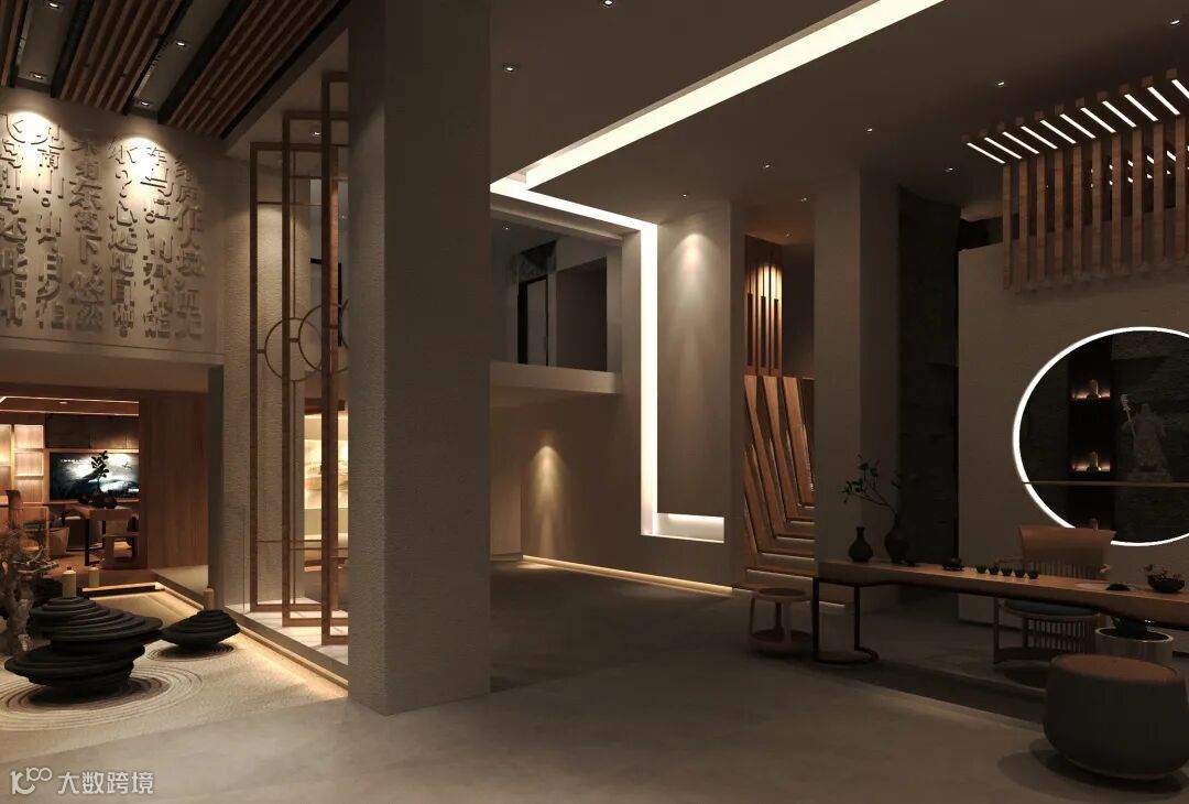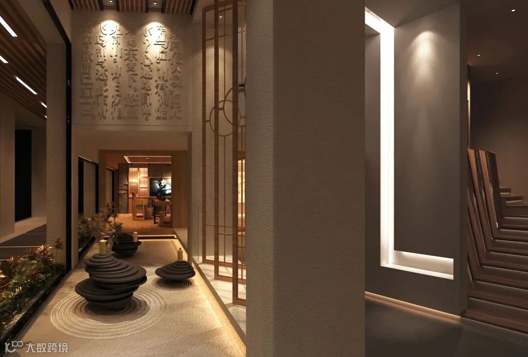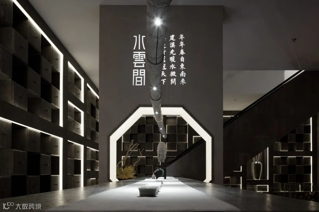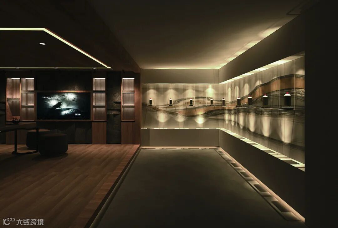 公馆以当代新派中式设计元素为基础调性,融合结构主义的区域规划,予以空间更具层次感的视觉感官体验。原木、自然石材、夯土肌理板为主要型材,软硬相间,呼应品牌行业——中国白酒所散发的刚劲有力、连绵不绝以及抑扬顿挫之质感;动中有静,静中有景,将客户体验与产品陈列贯穿其中,是商业与艺术的完美结合。