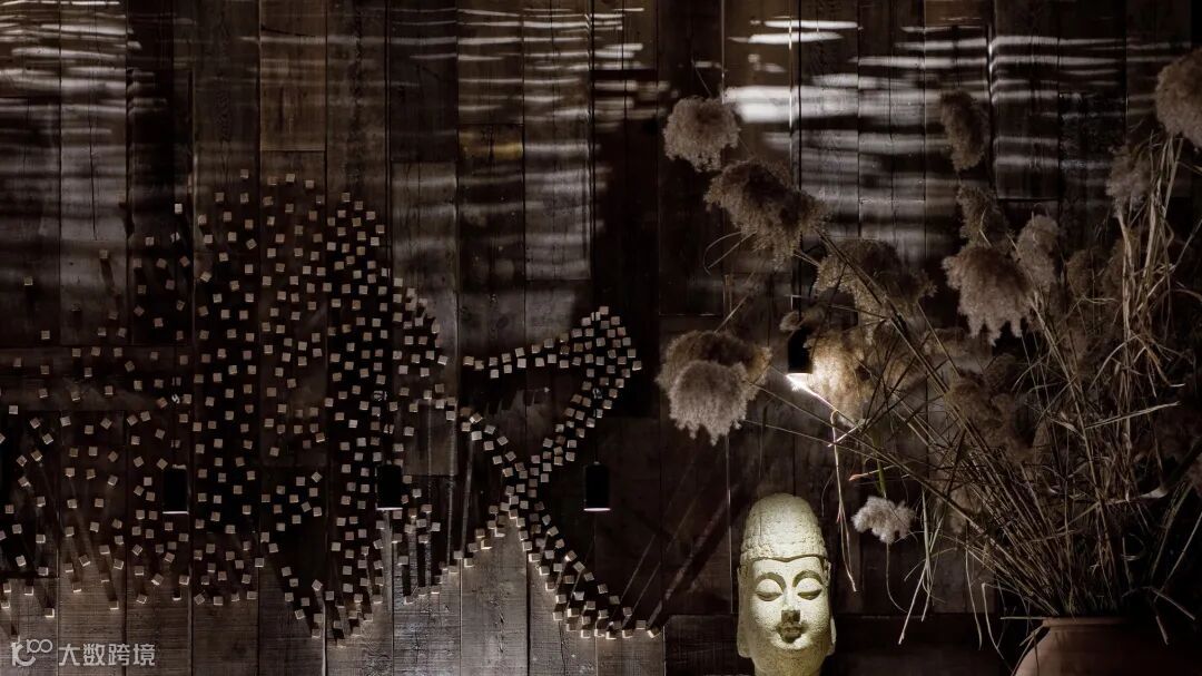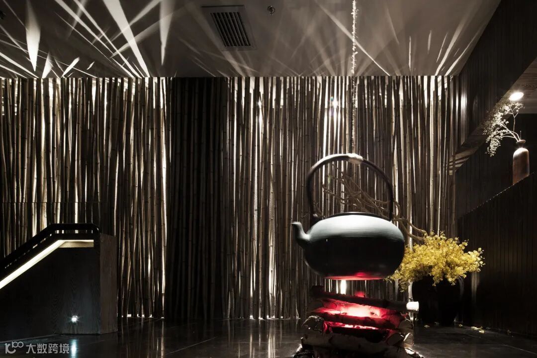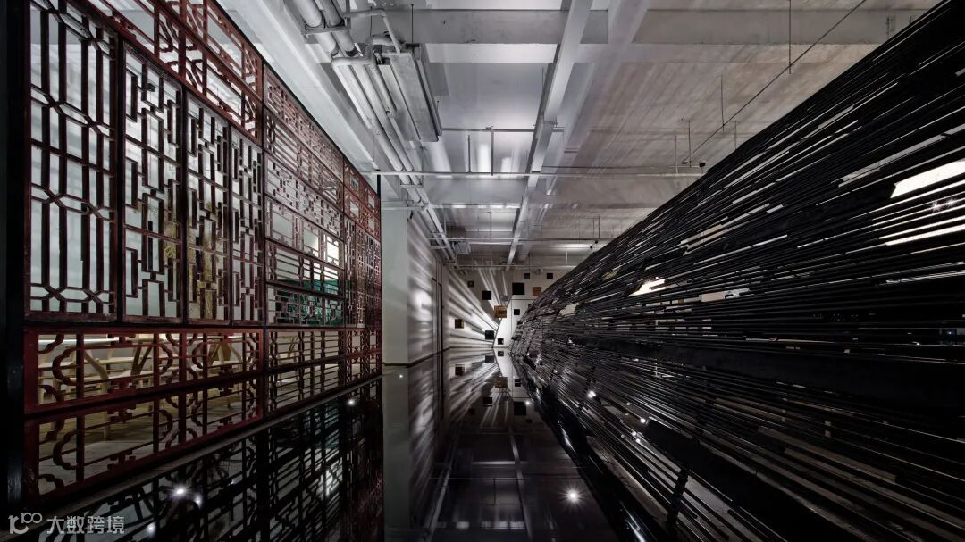 黑色的地砖宛若水面一般,灯光挤过天花竹竿的缝隙,悠然的洒在“湖面”上波光粼粼,更让人有置身水面的错觉。前台背景墙上“叙”字清晰可辨,而“品”则飘散在光影中。看似简单的两个字,将中华民族的禅意文化和汉字灵魂相融合,未来将有更多的“叙”品之作从这里诞生。本案主题除原生态禅意外,另一重点就是环保:所有墙面没有过多的粉刷修饰,采用经过特殊处理的旧木板,而会议室的隔断采用的是环保二手镂空木质隔窗。