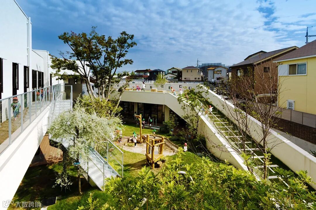 这是一个位于大阪南部的老园舍改建的案例。其设计有两大亮点:第一是,为了让孩子们在狭小的空间内有足够的活动量,设计方制作了很多可以循环跑的地方以及高低起伏不平的路面,孩子们会在追逐奔跑之中,被设计方的这些设施引导,或者跑上屋顶,或者跑下楼梯,就这样不断的在庭院和屋顶之间来回循环,最终孩子们的运动量实现了大幅的提升。第二是,这个地区的纺织产业闻名遐迩,设计方将纺织品作为设计包装的一个重要材料,为了让孩子们能够触摸到它,能够感受它的魅力,本设计用纺织材料制作了班级标签的底布,将毛毯贴在墙壁上,让孩子们能在玩耍中接触这些纺织品。