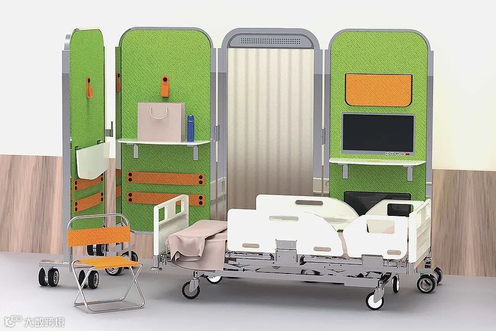 这个医院隔断系统提供了可移动的医疗空间,将提高医疗护理的质量。它配备一个可折叠的平面,提供额外的空间、无线充电及个人物品存储;一个空气净化器,可产生静电负离子,吸收病毒和PM2.5;一个触摸屏,可访问电子病历和医疗日志,以及降噪的橡胶轮。彩色编码的屏幕模块使医务人员迅速确定每个病人的情况,保障隐私,所有组件都可根据使用场景及空间要求轻松组装。