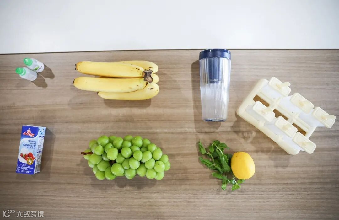 所需材料:薄荷精、香蕉、破壁机、冰棍模具、奶油、青提、薄荷、柠檬