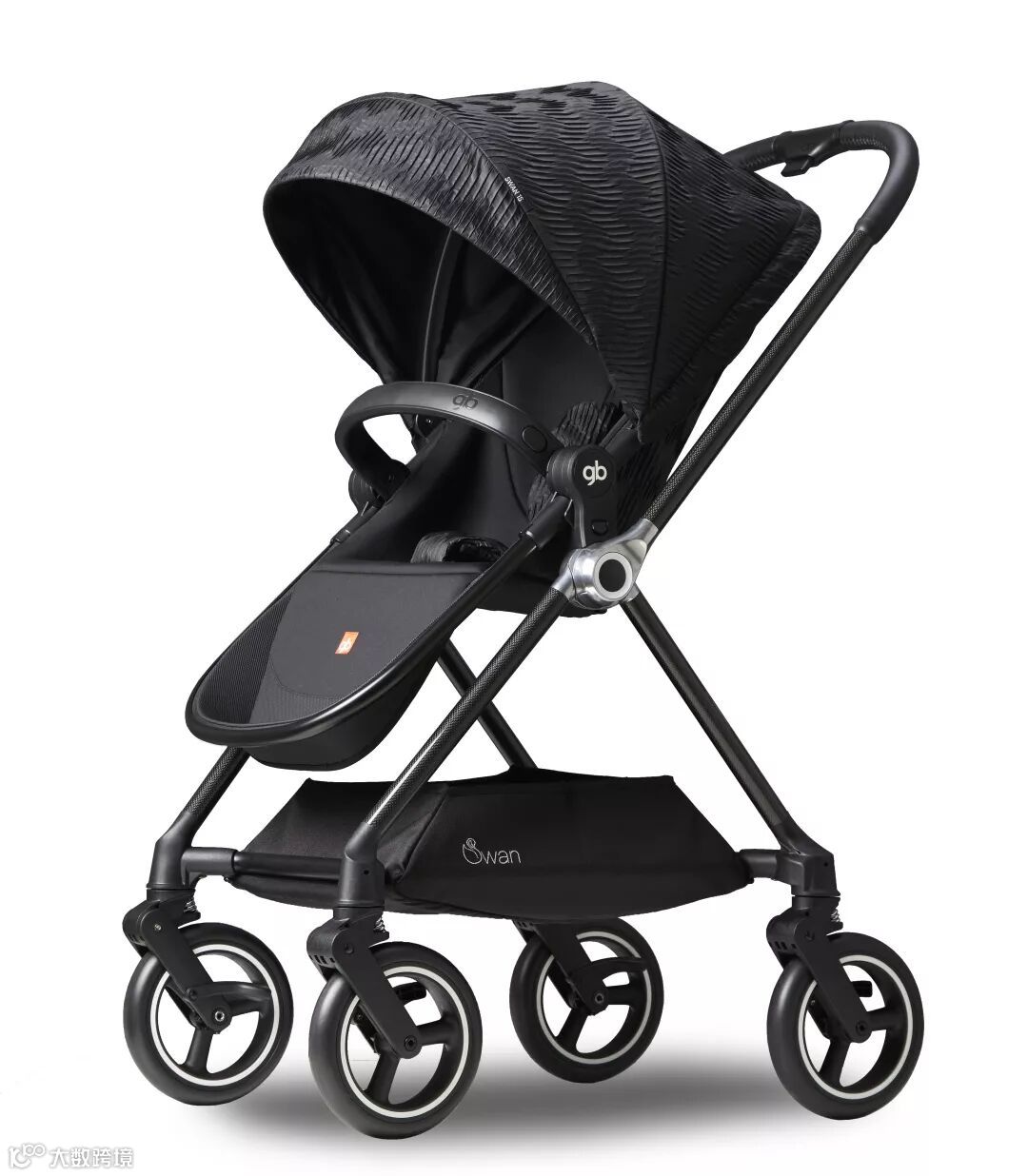 Swan专为初生婴儿设计,车身采用碳纤维管件及铝压铸关节,在保证车架的强度的同时降低了重量,整车仅重6.3KG。可单手换向,四轮自动旋转与定向,任何方向都可以轻松驾驭。
