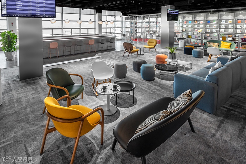 充满几何线条感的高脚凳,舒适柔软的沙发都可以一一体验一下。点杯咖啡,选张凳子,看着窗外的机场,享受一个惬意的下午。
