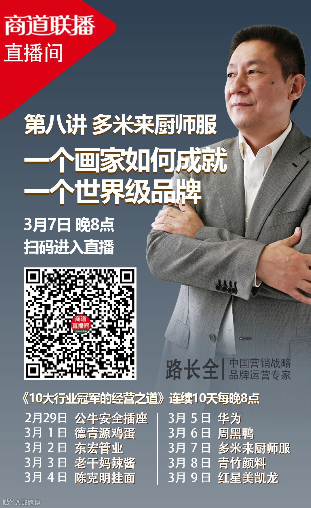 今晚8点直播,路长全老师将为大家讲述:多米来厨师服——成就国际高端品牌的4大智慧。