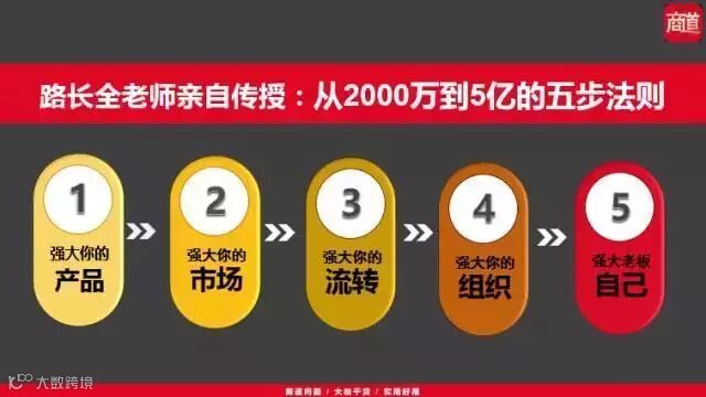 路长全老师为企业家们共讲解五个板块的内容,就是企业强大自己的五大法则,包括强大产品、强大市场、强大流转、强大组织和强大老板。这是路长全老师20多年营销实践的思想精华,路老师用这五大法则,指导公牛插座成为几十亿的企业,指导长寿花玉米油用6年时间从5000万做到上市公司。