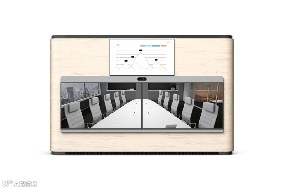 Cisco Webex Room Panorama视频协作系统可以让两个82英寸大的8K屏幕变成一个大屏幕,使参会者们即使身处异地,也可以感受到沉浸式自然会议体验。其还在全景视图上方附加了一个65英寸屏幕,以便于进行文档共享等会议期间的操作。