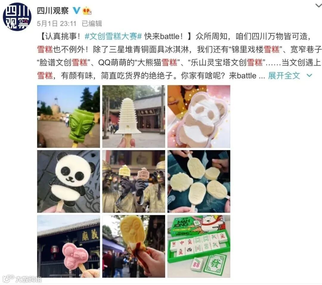 “四川观察”微博就发起了#文创雪糕大赛#的话题,各种造型迥异又带有强烈四川地方文化特色的文创雪糕强势刷屏,掀起雪糕界的一场视觉盛宴。