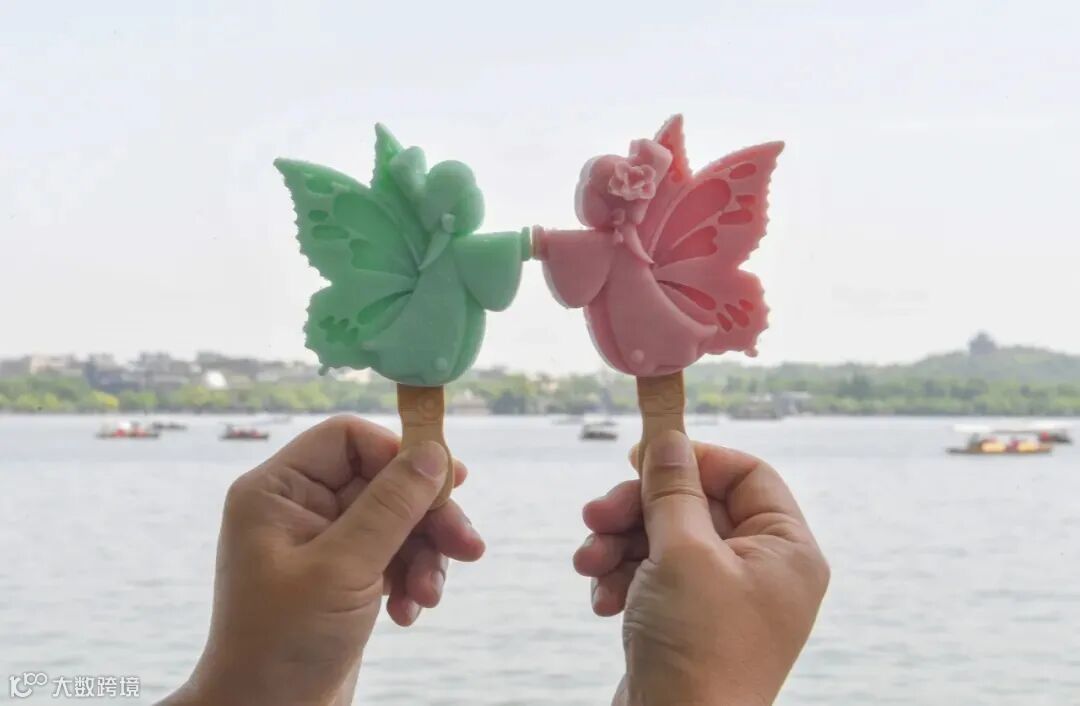 梁祝化蝶、白蛇许仙断桥相会等耳熟能详的文化故事也被做成文创雪糕,不仅造型Q萌,凑对“嗑CP”的玩法也符合当下年轻人的独特心理。