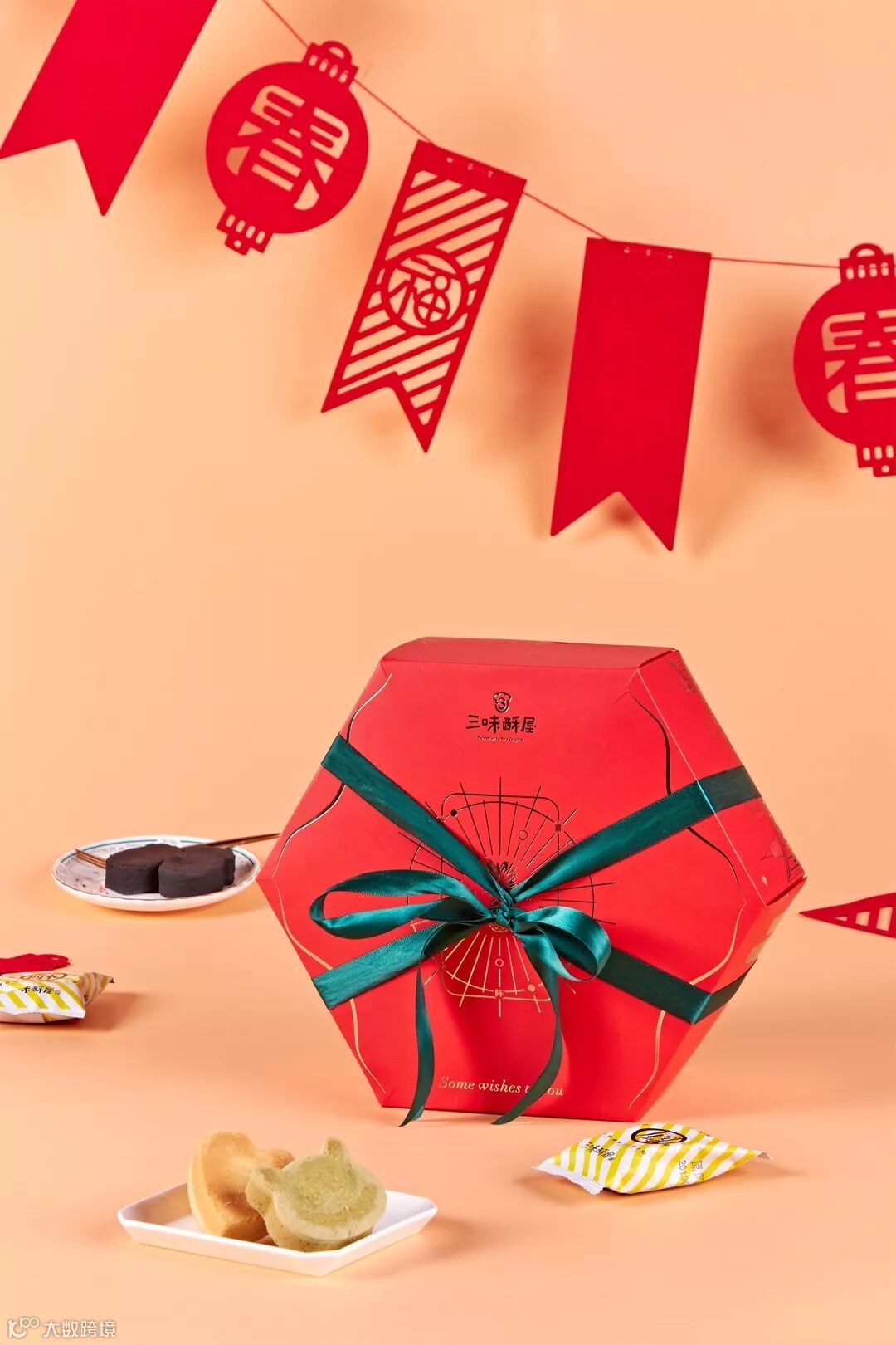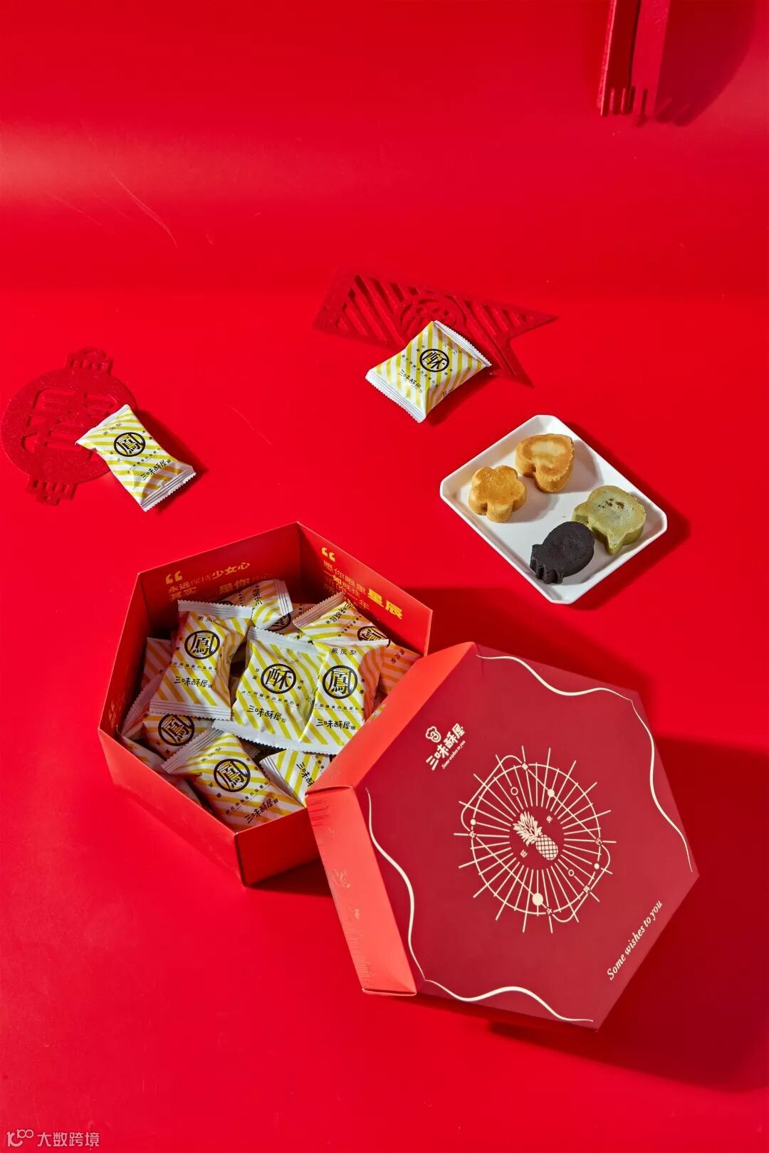 老厦门婚俗习俗中有“三盒”的说法,闽南婚礼习俗中,首饰盒、梳妆盒、针线盒三盒是陪嫁的重要物件,其中六边形的陪嫁囍盒最为典型,礼盒盒型设计灵感来源于此,寓意祝福与幸福。盒子正面融合闽南语“欢喜斗阵行”还有闽南凤梨,俗称“旺来”,寓意好运连连。盒子为天地盖设计,打开盒子像打开盲盒一般,内藏惊喜。打开一层外盒,内里是雪梨纸,拆开后装着满满的心意糕点,一层层打开,有一层层的惊喜。吃完酥点还能发现盒子周边跟底部都有惊喜文字祝福,一盒装载满满祝福的礼盒。礼盒选用定制丝带,拆礼盒也满满仪式感。