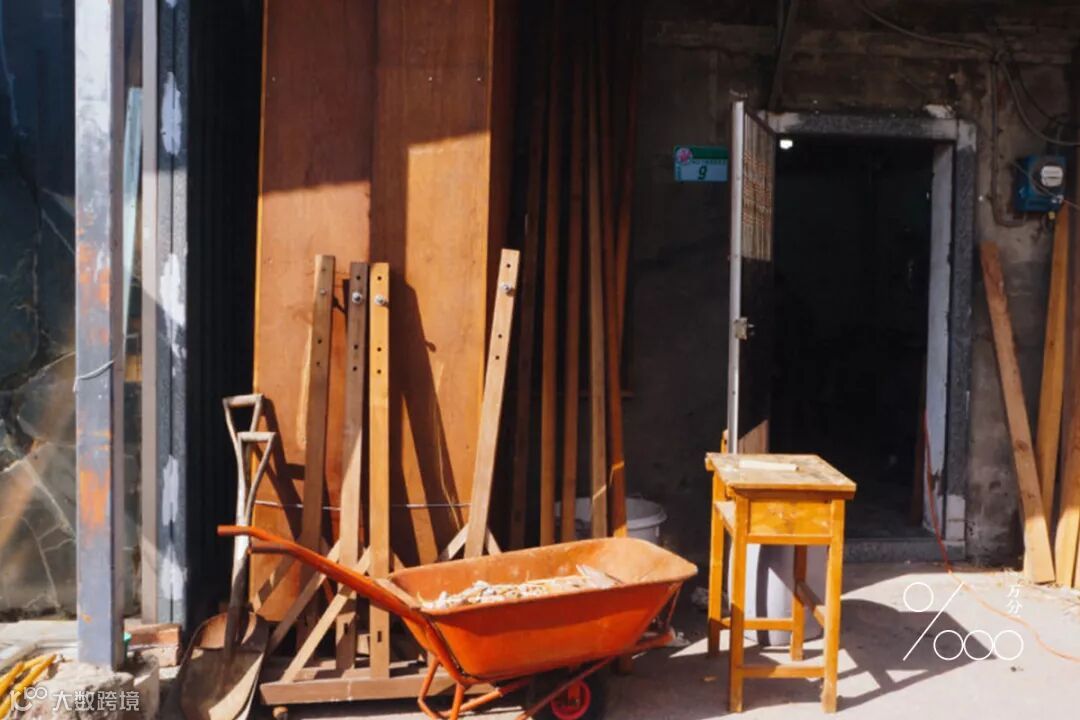 ▲林立正的工作室从外看来十分简陋,门口摆放着许多木料