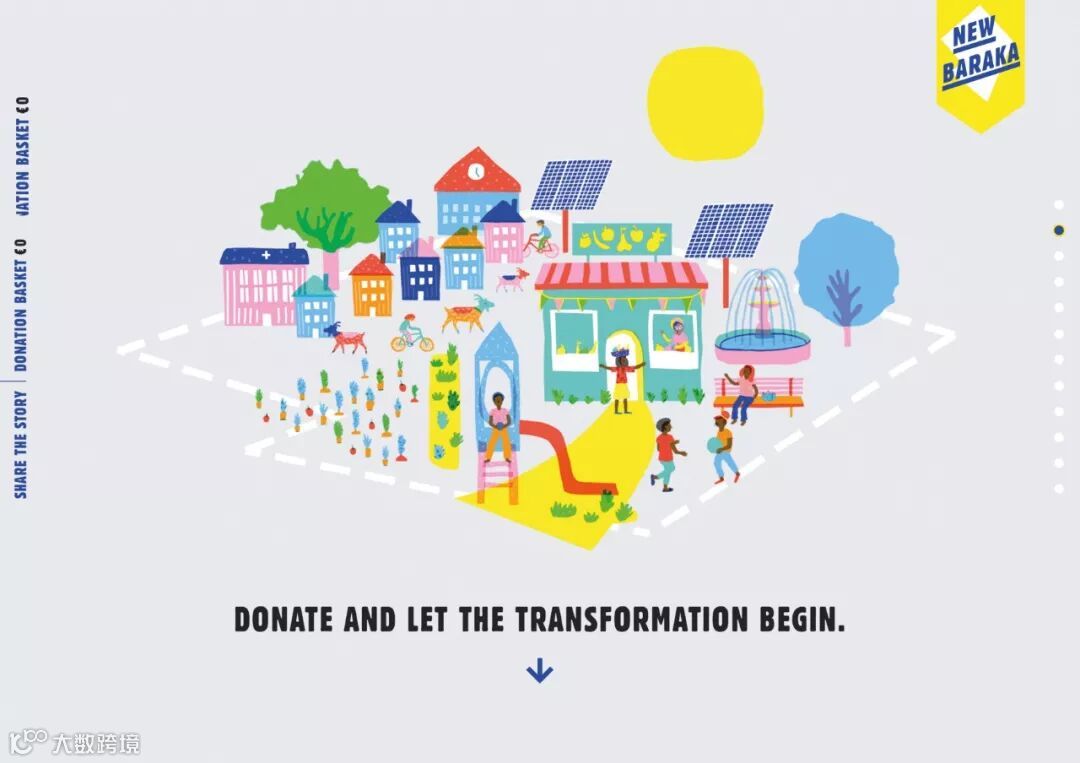非洲塞内加尔首都的巴拉卡贫民窟,20年来都未受到官方的重视。于是YOU基金会设计了一个网站,以童趣的色彩和动画将建造新家园所需的种子、教学用品、玩具、燃料到通讯工具等分门别类,并附上各自所需金额,让人一目了然。网站上线一个月就突破了100万欧元的捐款。