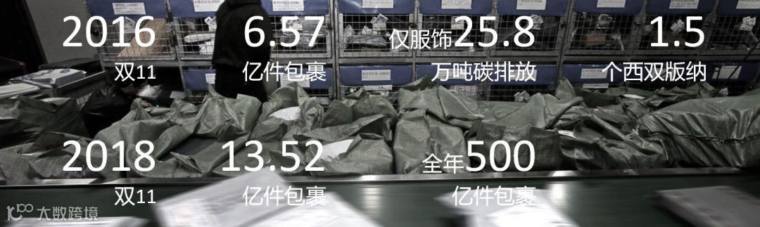 今年的双十一全网销售产生快递13.52亿个,是2016年双十一快递的两倍。而国家邮政局预计今年全年将产生500亿个快递包裹。快递业的运单纸、编织袋、塑料袋、纸箱、填充物、胶带、赠品等等,都是大量碳排放的始作俑者。