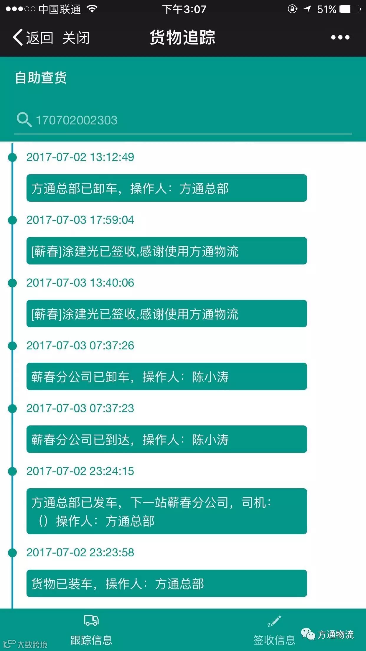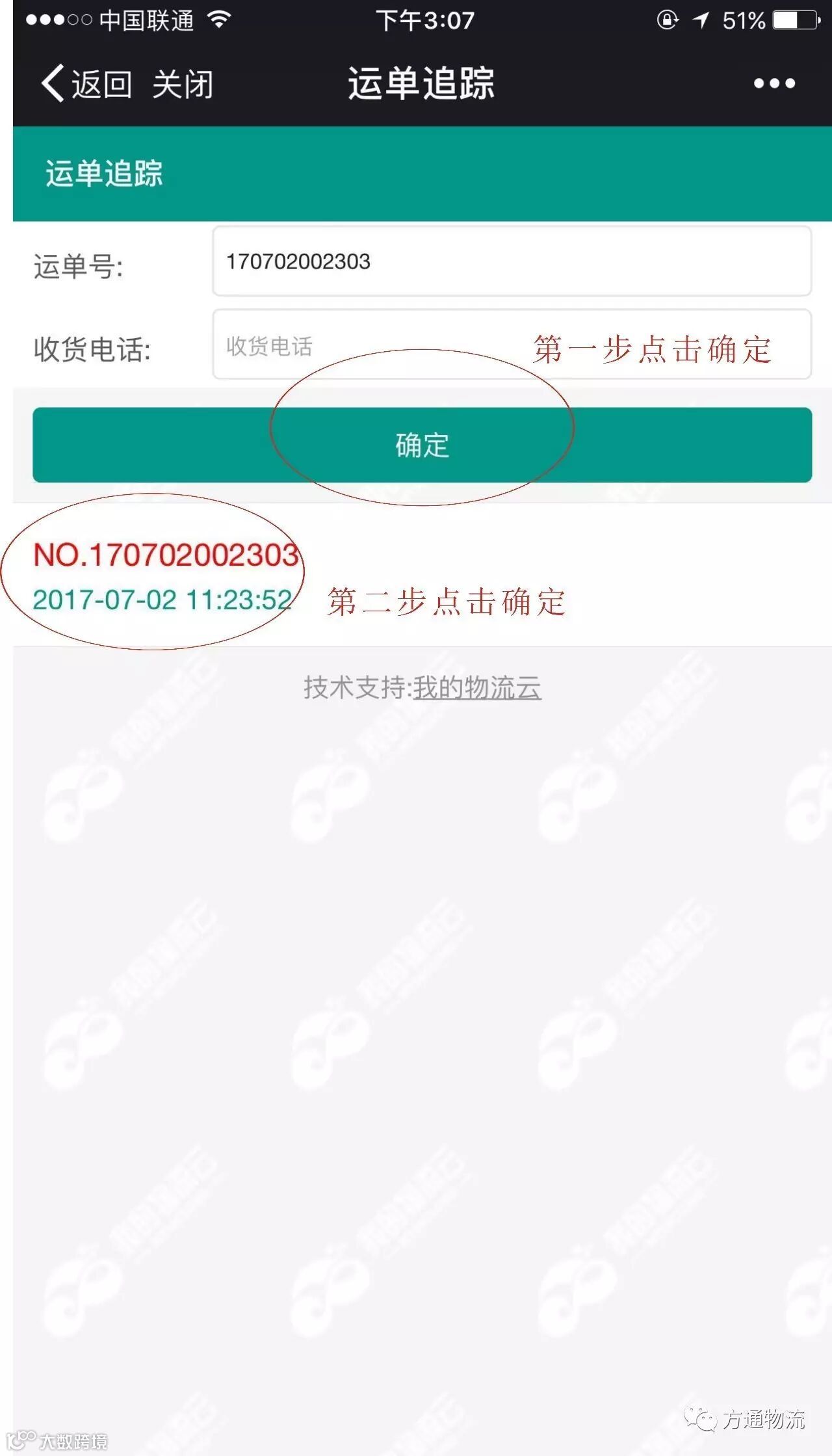第四步:输入方通物流货物运单号或者收货人电话,点击确定,弹出红色运单号后点击红色运单号。(注:方通物流运单号是以1707020*****开头)