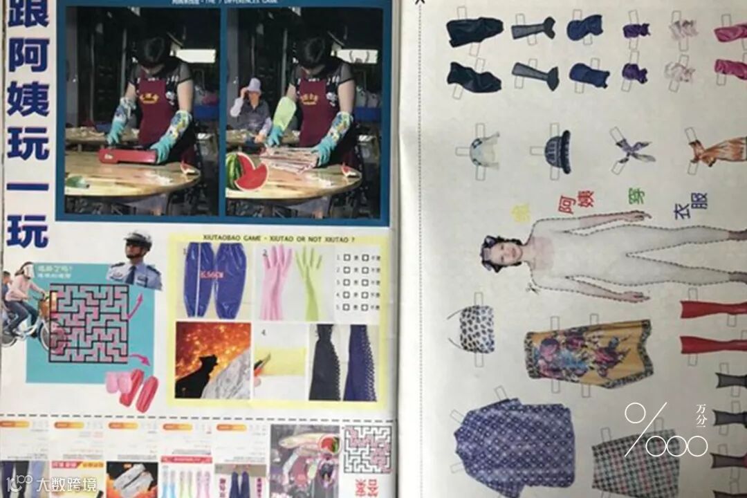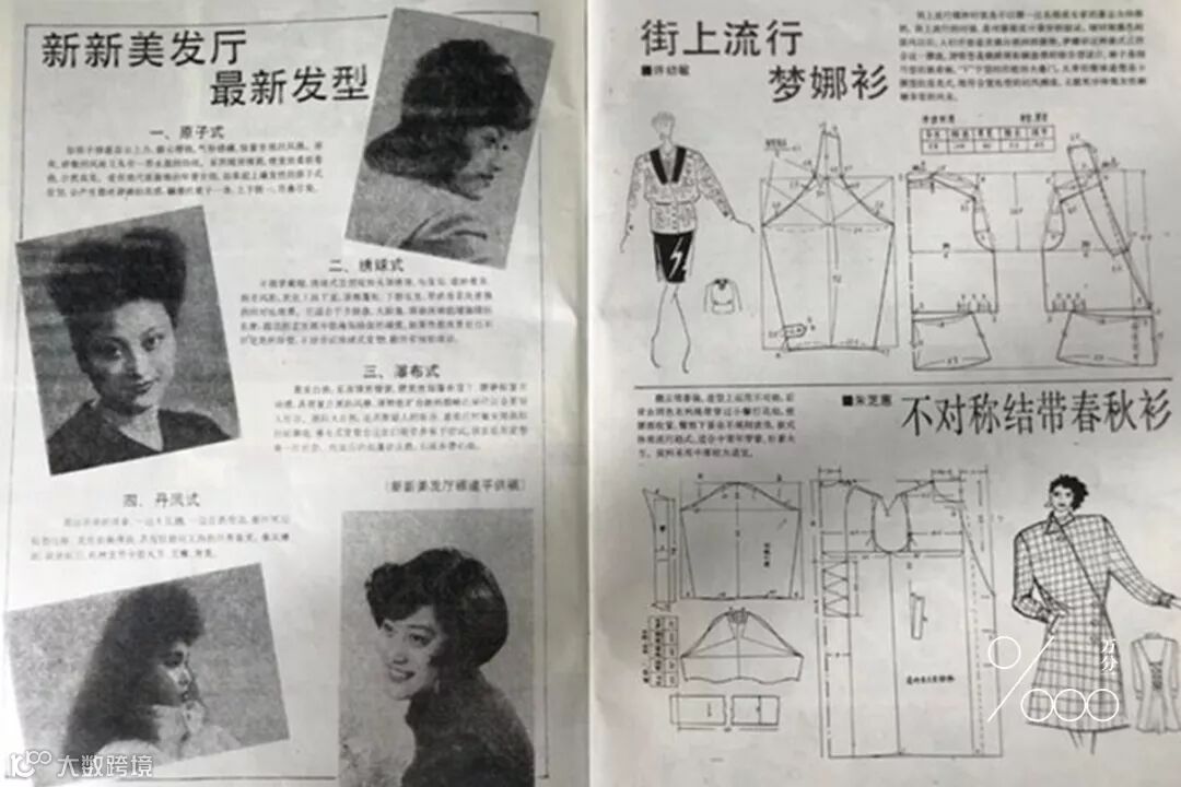 杂志的排版、语言、图像都呈现出了八九十年代的风味。你能从里面看到老式染发香波、上海缝纫机四厂的广告,还有“新新美发厅最新发型”、“街上流行梦娜衫”的时尚解析,有迷宫、答题和可以做手工的“给阿姨穿衣服”模版。