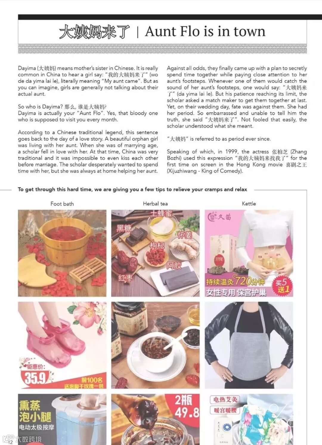 《大姨妈来了》这一页就记录了关于足浴(foot bath)、喝热茶(herbal tea)以及保暖(kettle)三种治疗生理痛的“土办法”。