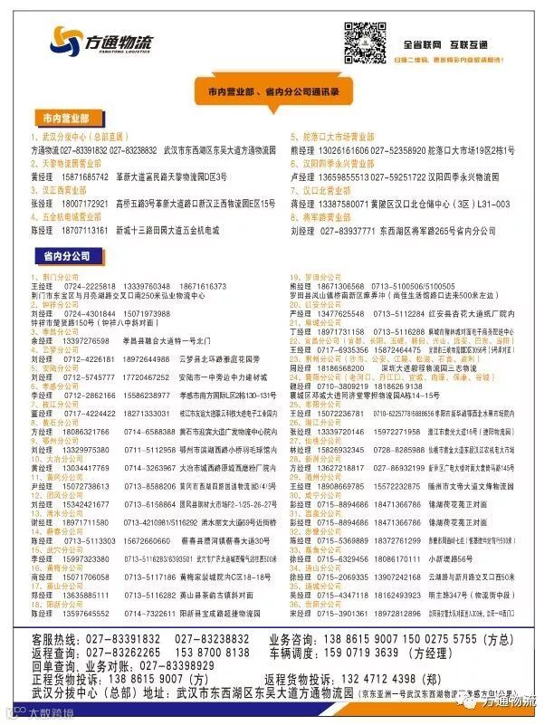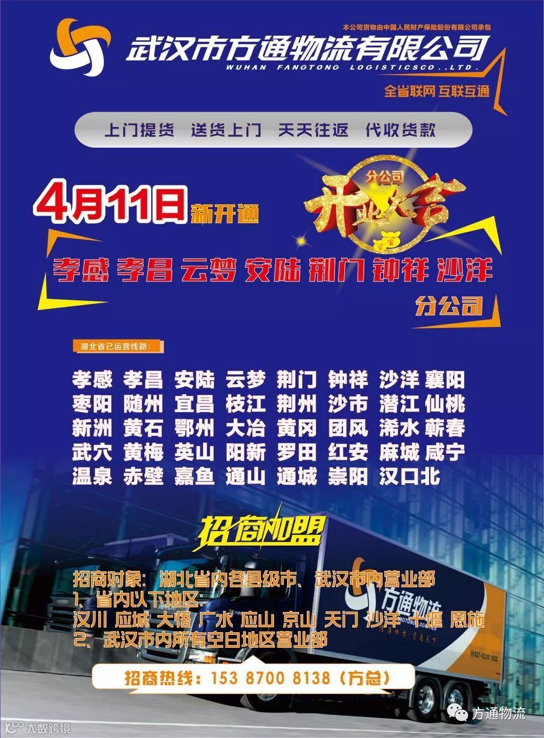 首先感谢各位您一直以为对方通物流的支持与信赖!为了满足广大客户的需求,🎉🎉🎉我司定于4月11日开通孝感,孝昌,安陆,云梦,荆门,钟祥,沙洋分公司,🎉🎉🎉专线直达,天天往返。望广大客户继续给予支持!方通物流将竭诚为您提供更加优质完善服务。