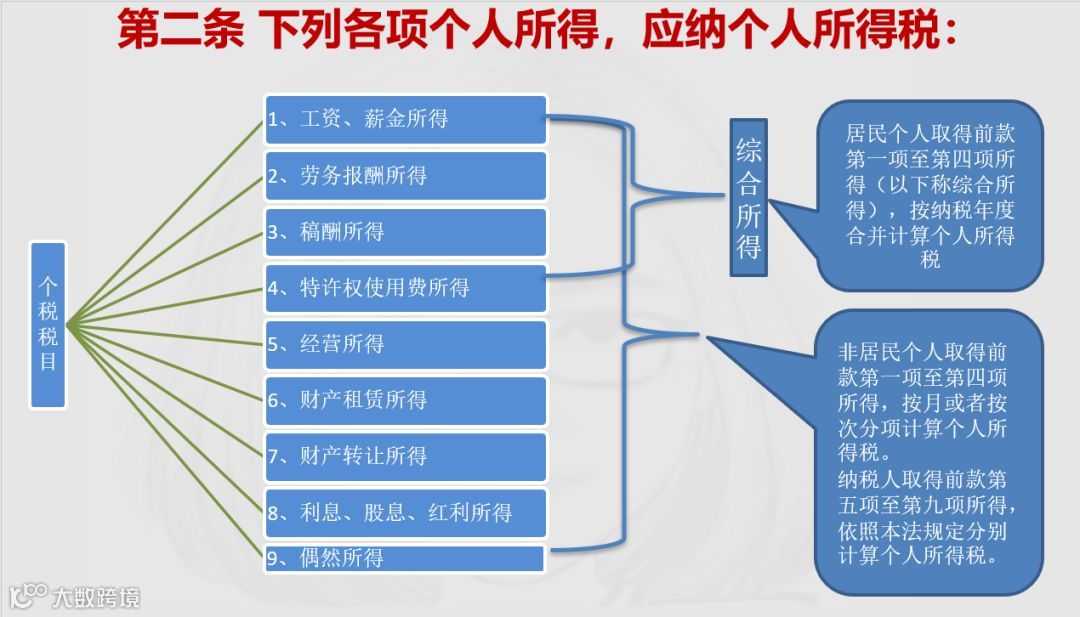 居民个人取得前款第一项至第四项所得(以下称综合所得),按纳税年度合并计算个人所得税;非居民个人取得前款第一项至第四项所得,按月或者按次分项计算个人所得税。