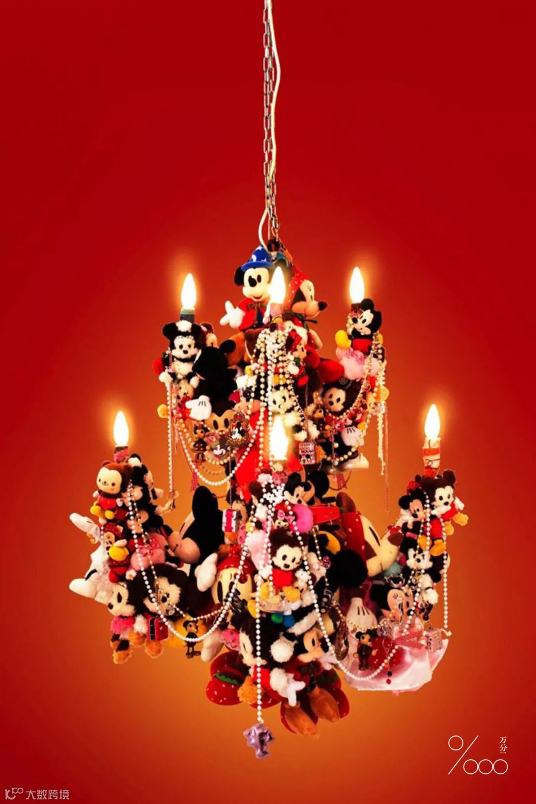 这盏使用许多人耳熟能详的毛绒玩具组成的立体吊灯,颜色缤纷多彩,颇具童话色彩,仿佛只存在与故事那座糖果屋。