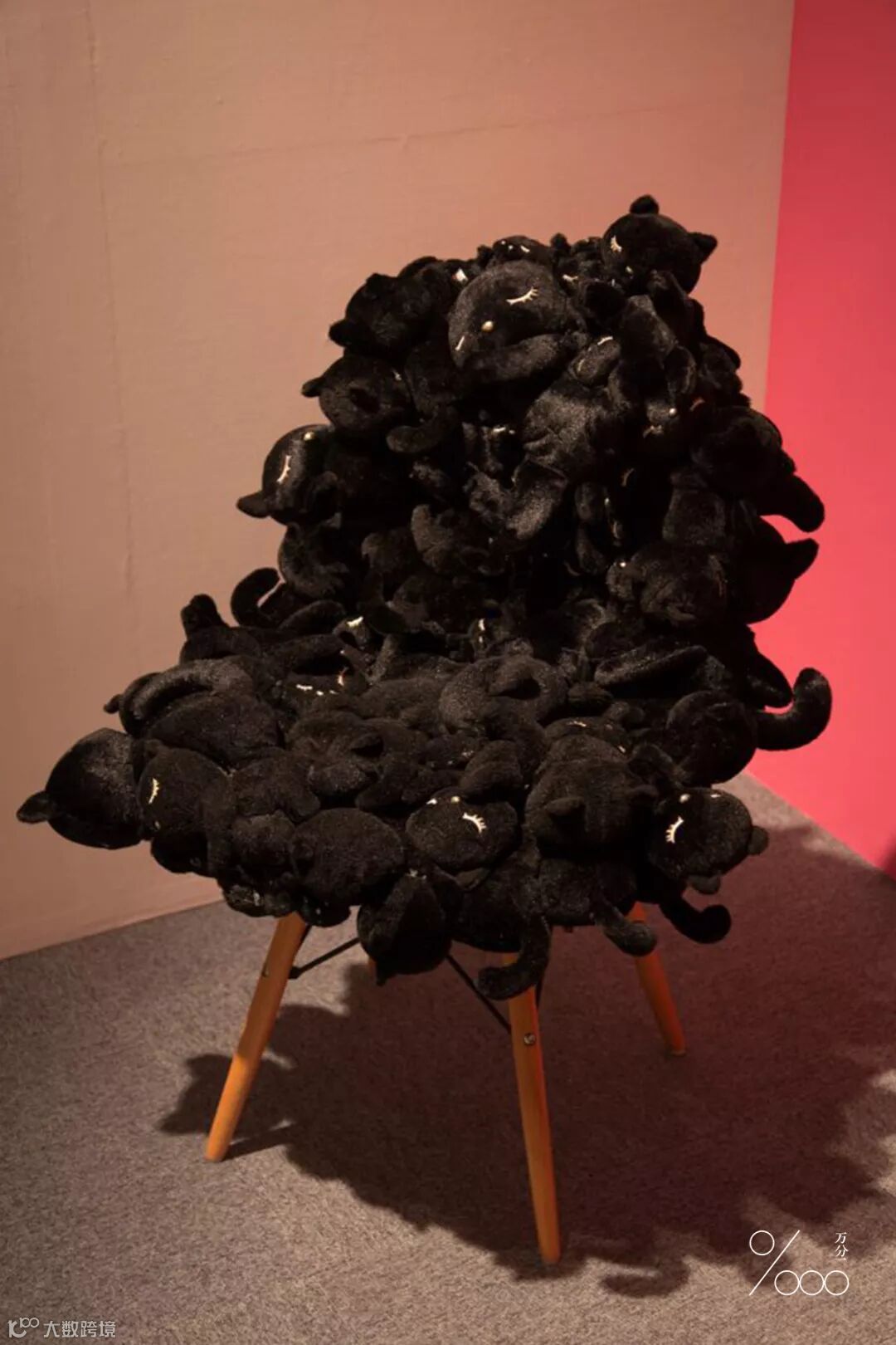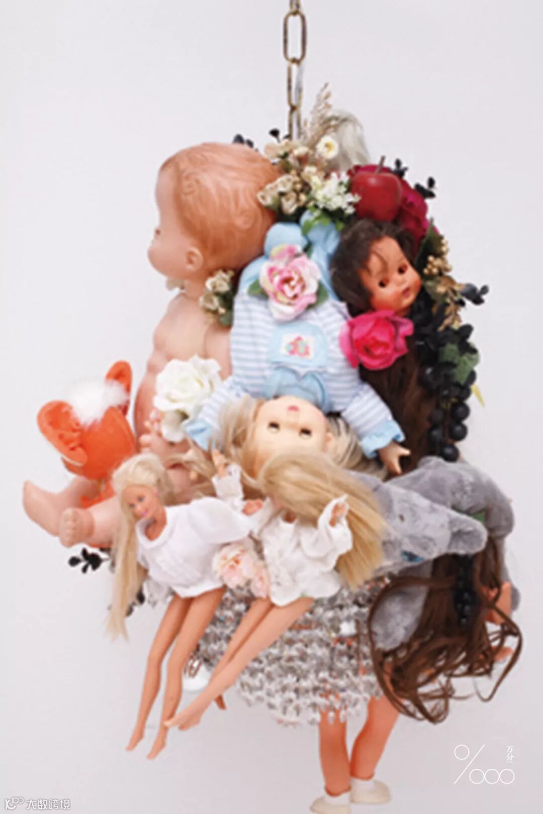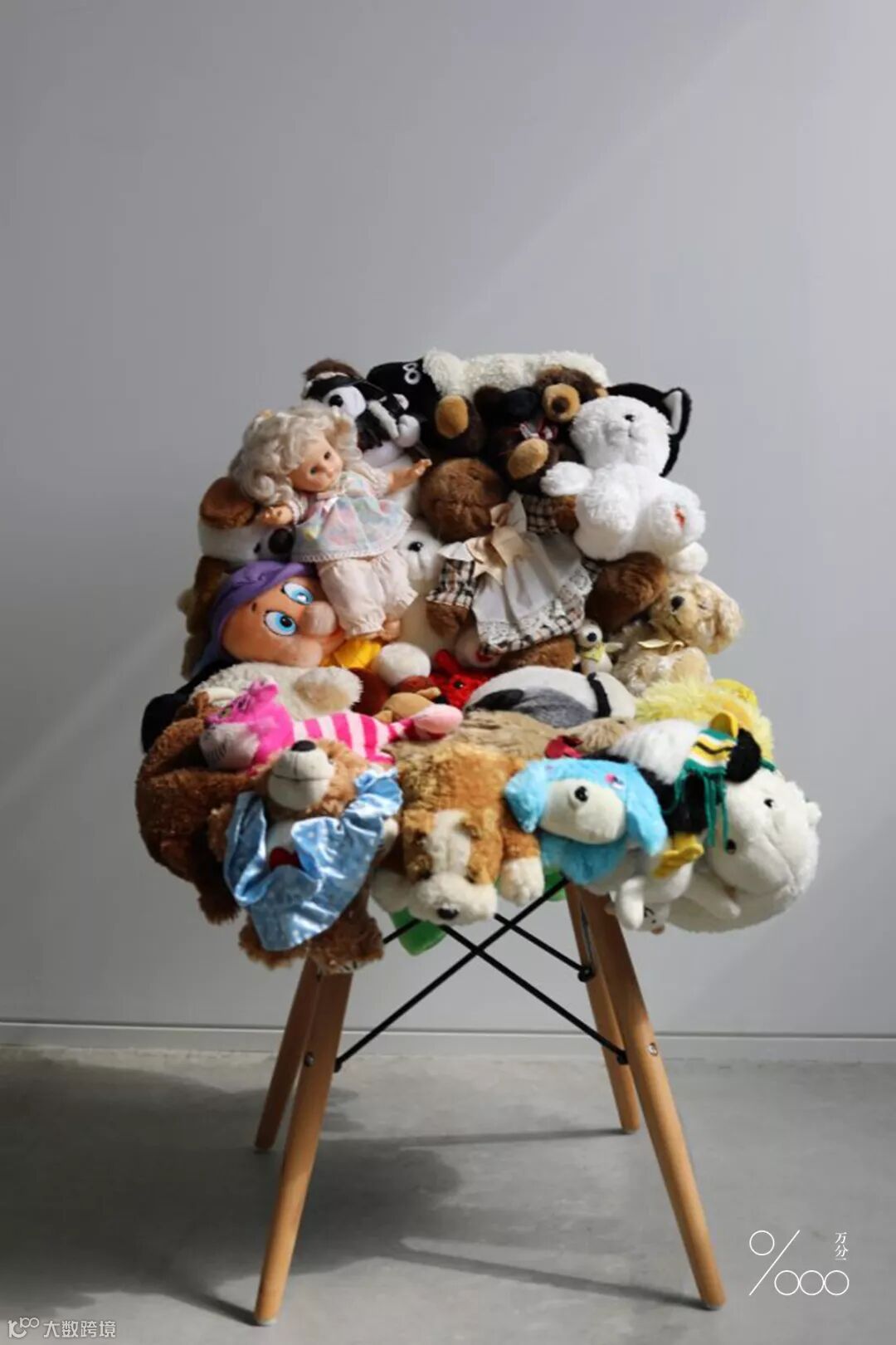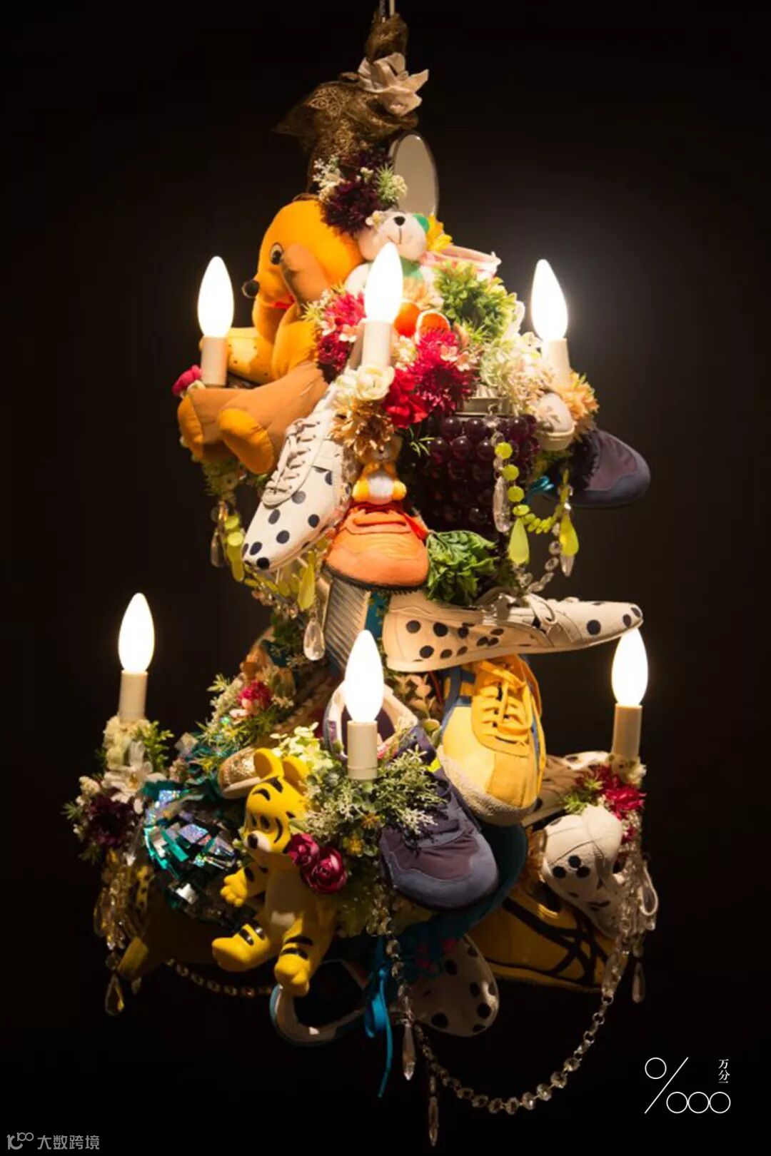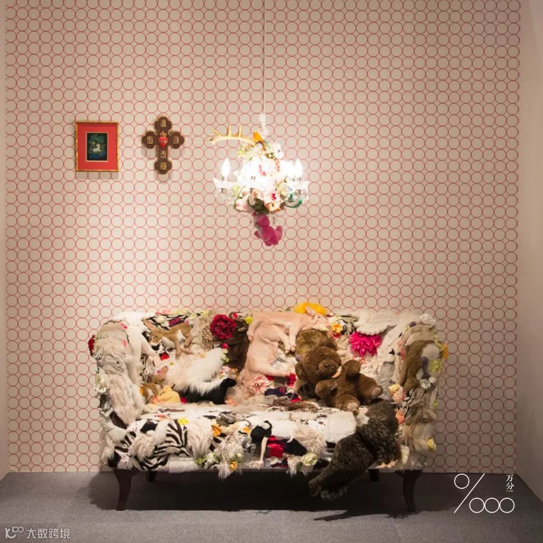 她的作品大多采用已有的材料:毛绒玩具、二手鞋包、人造珠宝等,是“废物再造”的立体组合创作。