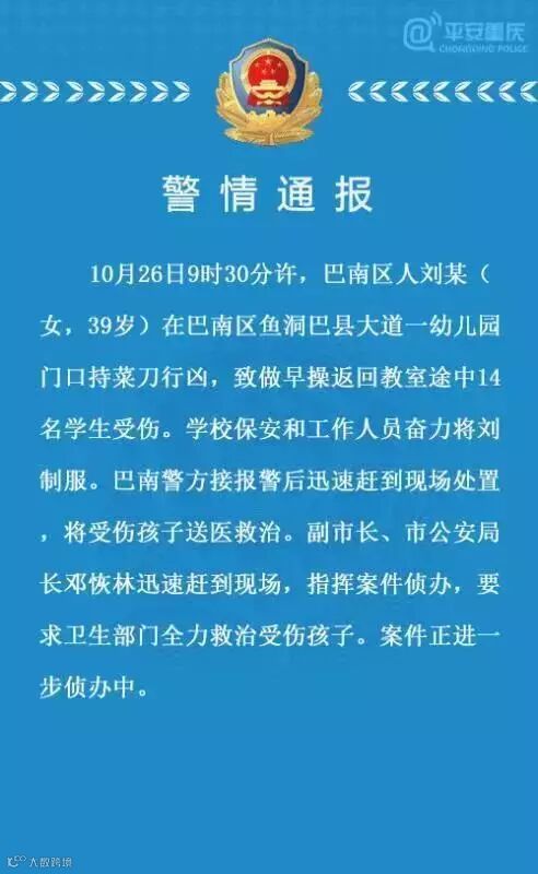 巴南区公安分局相关负责人告诉澎湃新闻,上午约9:30分,重庆市巴南区新世纪幼儿园教师带全体幼儿做早操。完成后,老师带幼儿返回教室途中,39岁巴南区女性居民刘某突然冲入人群持刀行凶。