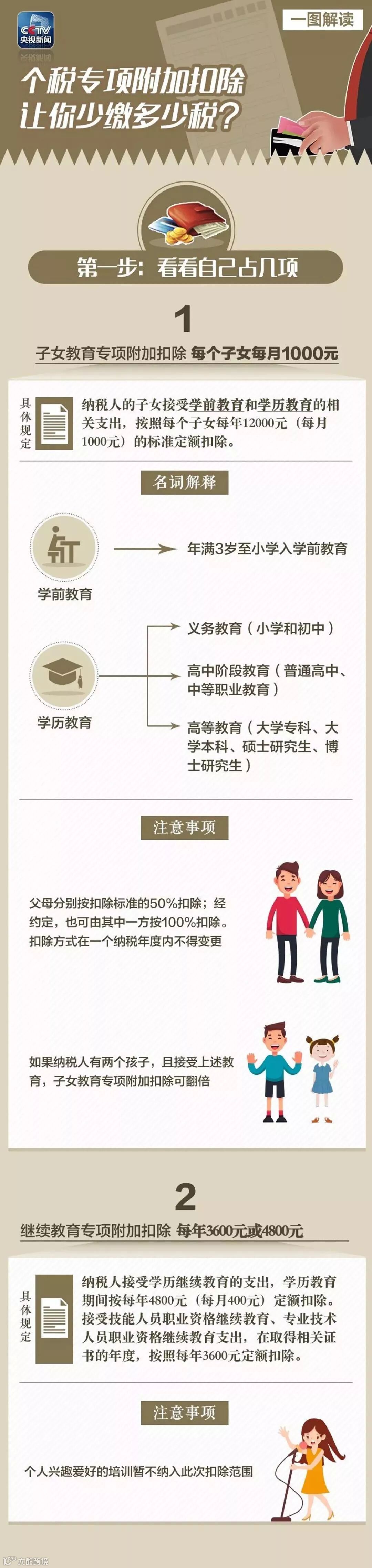 《暂行办法》明确了个人所得税法规定的子女教育、继续教育等6项专项附加扣除的具体实施办法。享受这些专项附加扣除,需要哪些条件?通过这些扣除项目,纳税人可以少缴多少个税?跟随下面这张图,一起来算算。