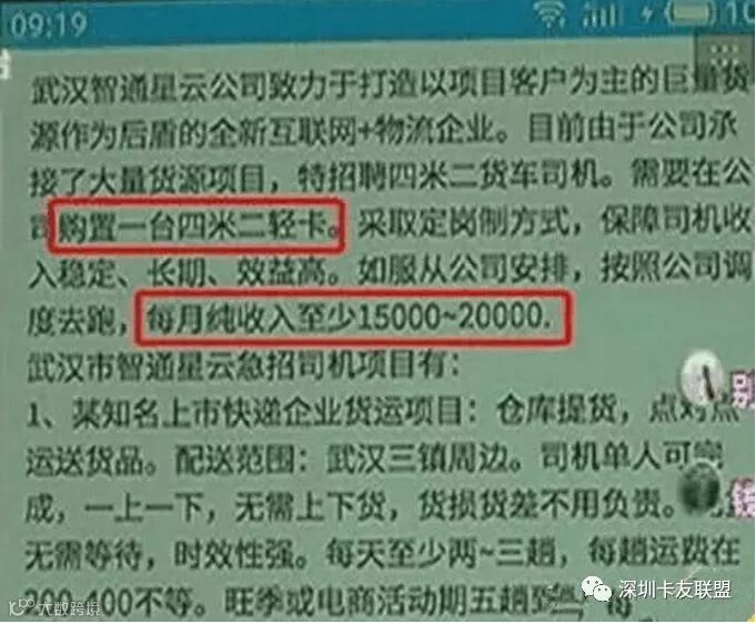 钱都想赚,工资高谁都喜欢。最近一群司机在网上看到一家武汉智通星云物流公司在大量招聘司机。招聘网广告介绍,他们公司活多,车少,需要招司机扩大业务。月收入一到两万,长期有活。但必须要入职的司机带车加盟,无车的司机需要在公司购置车辆。这些司机为了能挣到高额的收入,都是分期在物流公司买了车。而且在公司买的车的售价要比市场价普遍高出三万元左右。