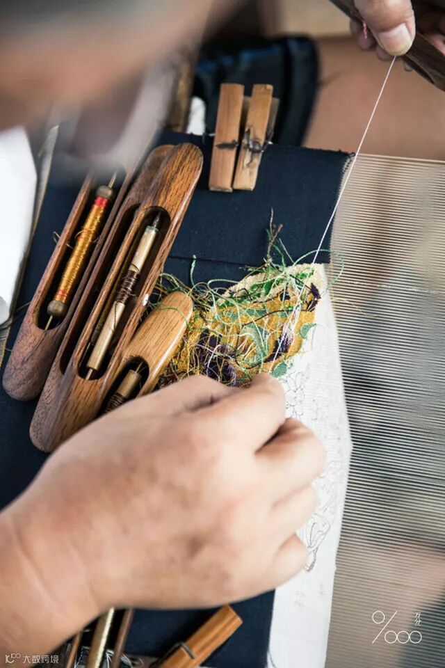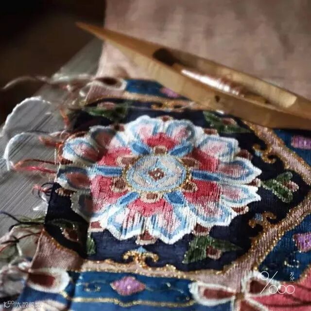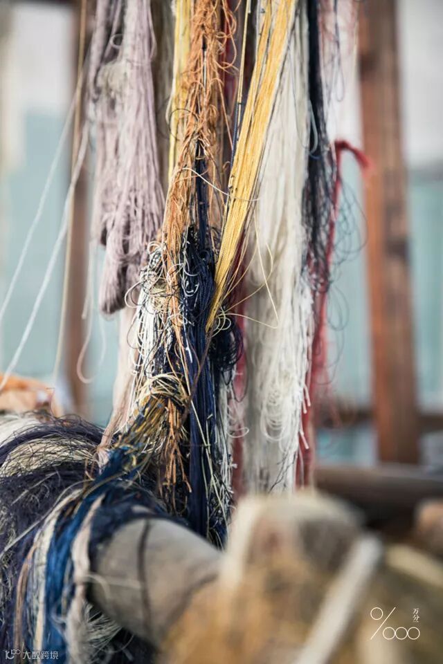这门古老的手工艺术,以缂织方式织造,需要落经线、牵经线、套筘、弯结等十六个步骤。