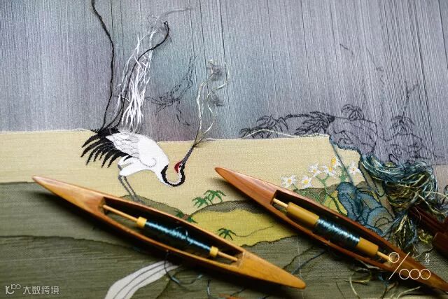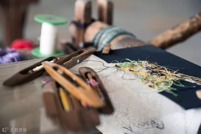 它的织造工具是一台木机,几十个装有各色纬线的竹形小梭子和一把竹制的拨子。织造时,手艺人坐在木机前,按预先设计勾绘在经面上的图案,不停地换着梭子来回穿梭织纬,然后用拨子把纬线排紧。织造一幅作品,往往需要换数以万计的梭子。