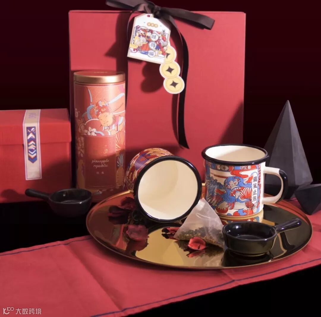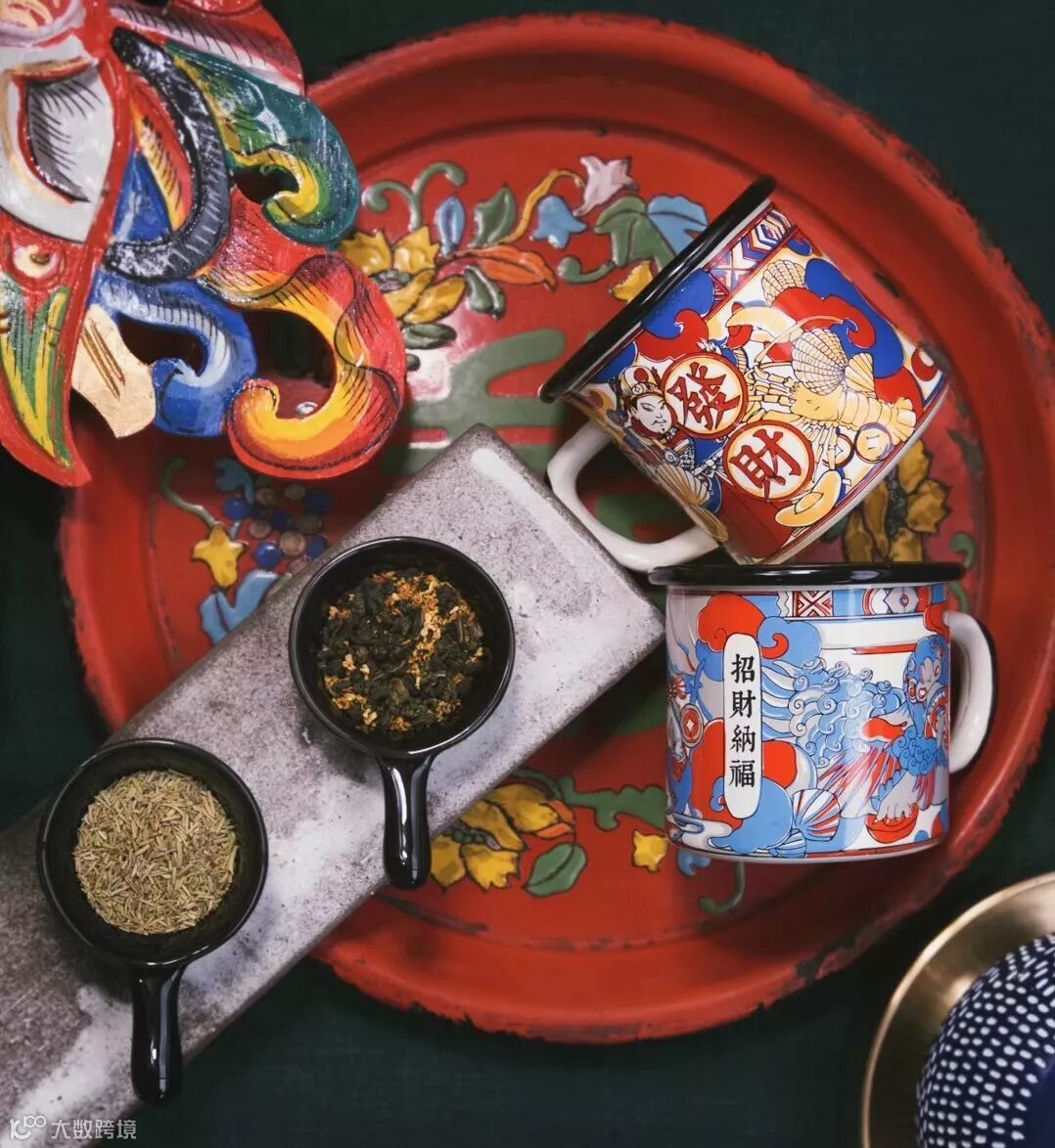 内含:“旺来”果香红茶一罐、搪瓷对杯一对、手工色釉陶瓷茶碟一对、红红火火茶席一张