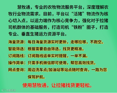 作为一款专业的农牧运输管理系统,慧牧通致力于通过运用云计算、大数据、物联网等最新技术,全面赋能中国涉农物流企业。在整个后非瘟时代的大环境下,专注提供符合客户需求的“车辆在线管理、业务在线操作、运输过程在线监管”等全流程专业的解决方案,有效提升农牧物流企业的综合效益。