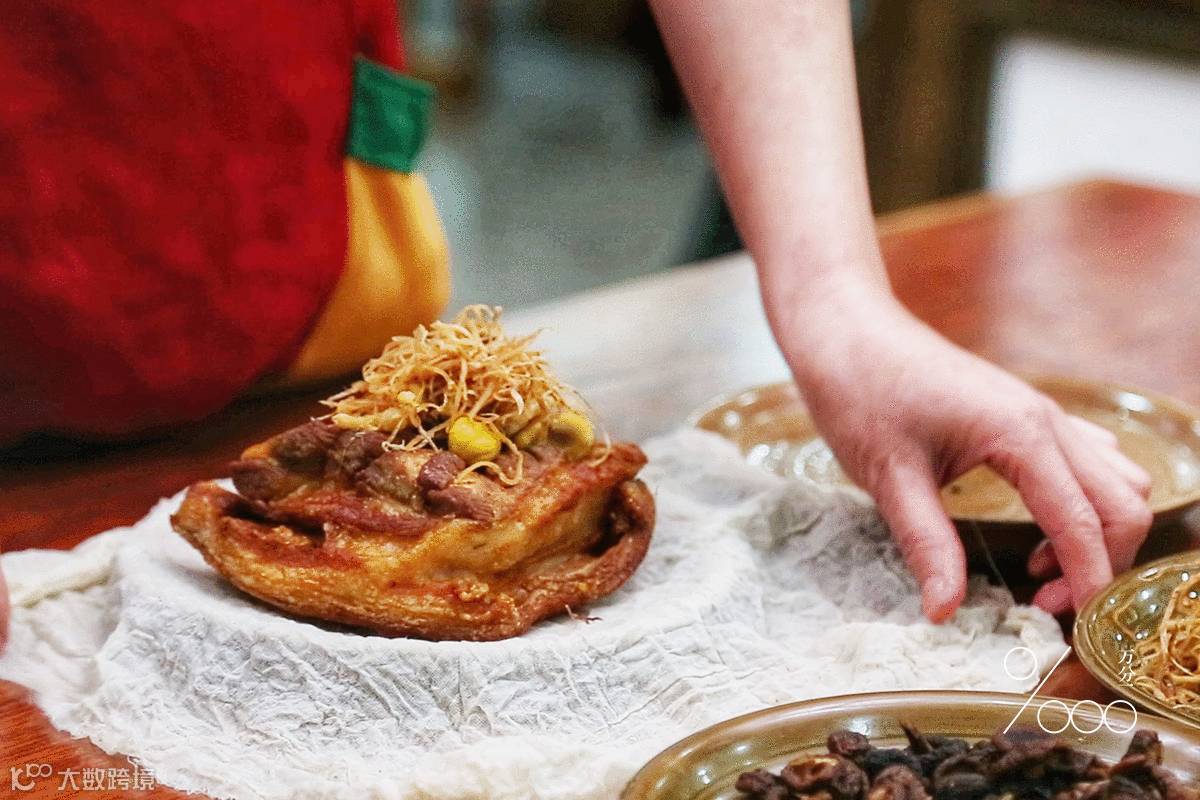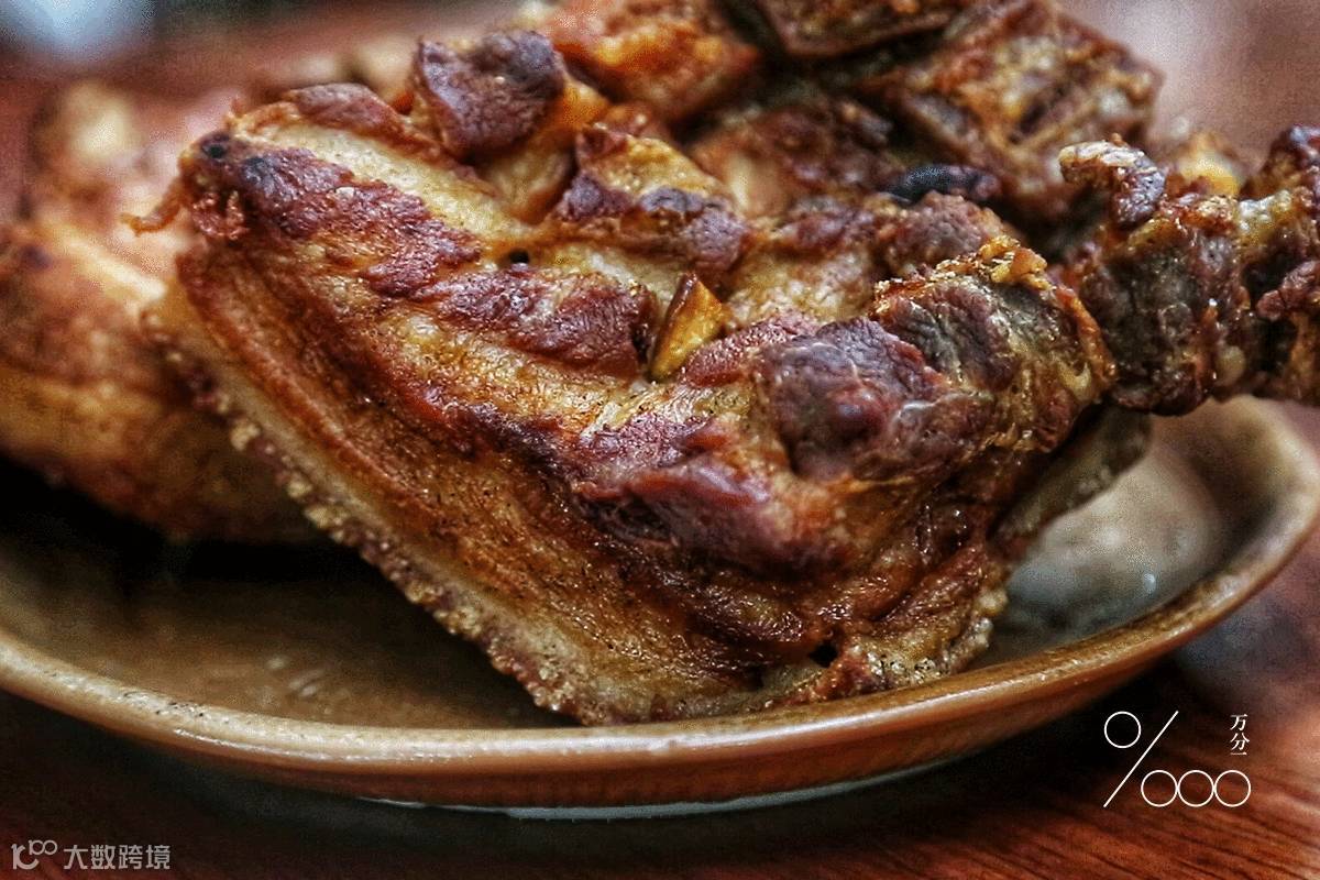 每一块方方正正的猪肉约两斤重,先用清水冲洗干净,再经汆烫、捞起、沥干,后用盐巴、八角、当归、大茴和小茴等腌制两个小时,将其捞出过油并炸至金黄色。