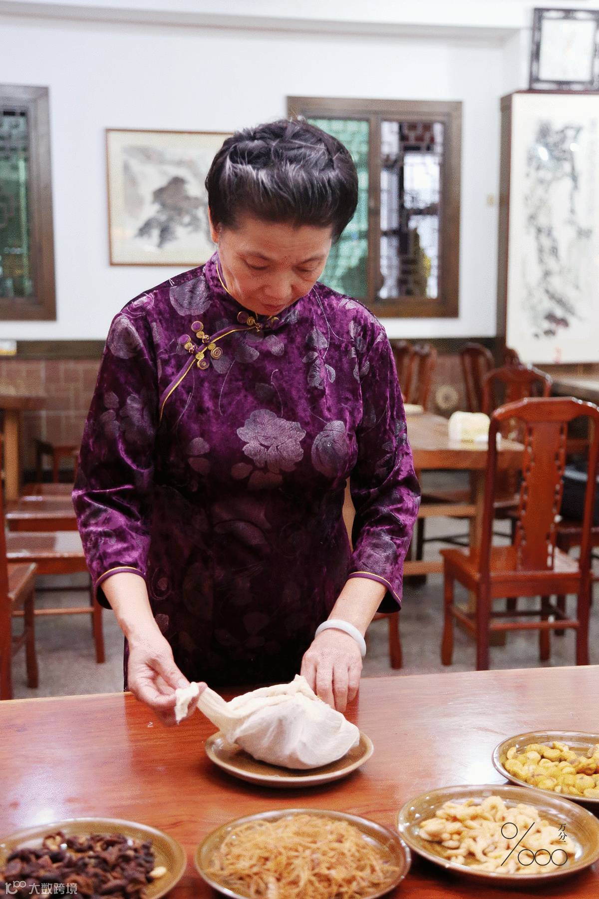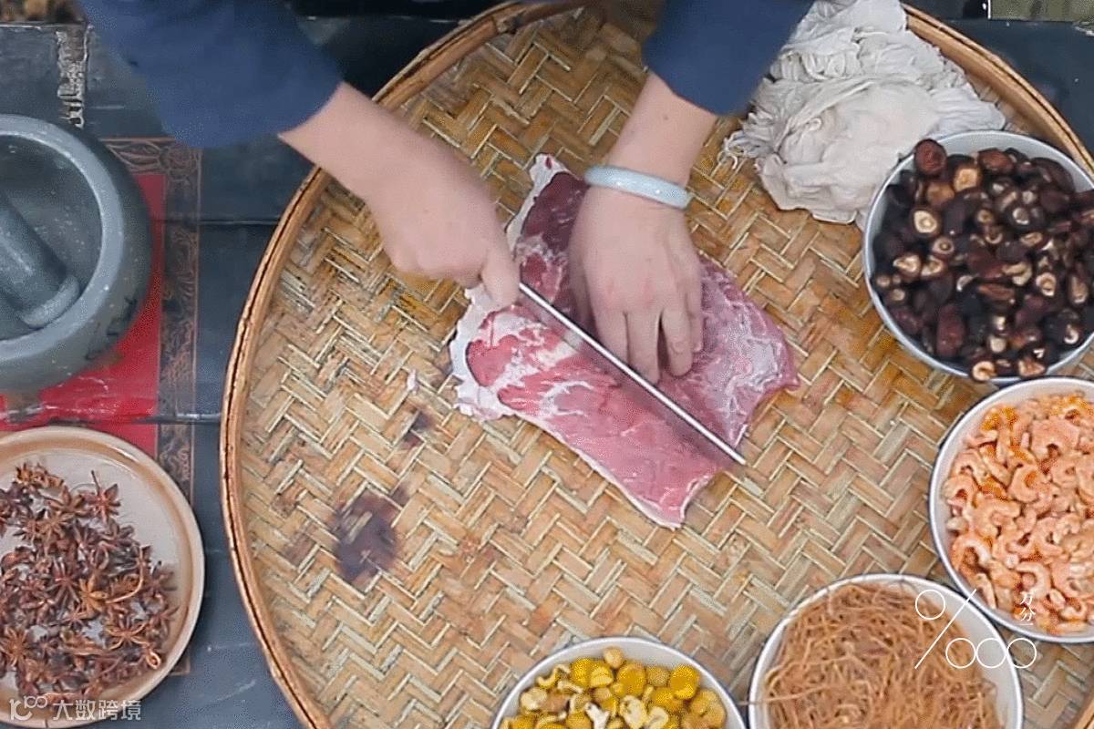 接下来需取香菇、板栗、虾仁、鱿鱼丝等备料与油炸过的猪肉,用纱布包裹起来,束好封口,每一包就是一块等待封焖的封肉包。