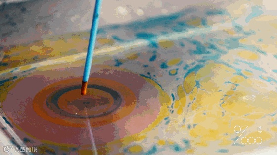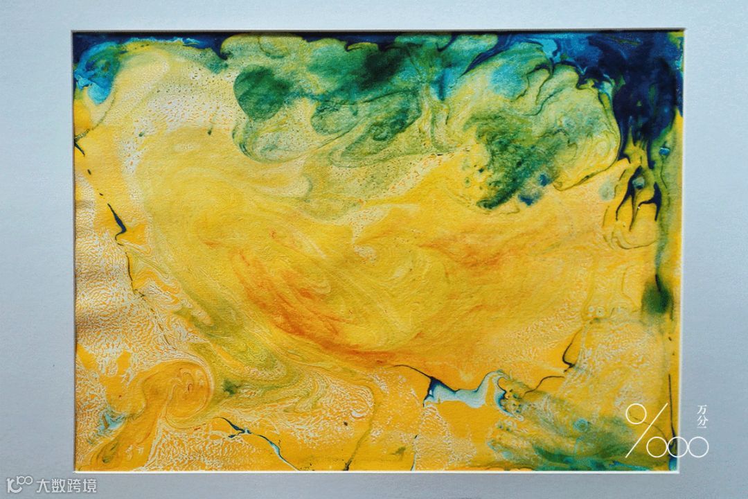 颜料本身不溶于水,等于是用颜料在水上作画,等到水面上的画完成后,就把白纸盖在上面吸取颜料,然后小心翼翼地将纸抽离水面,就成就了具有流动效果的作品。