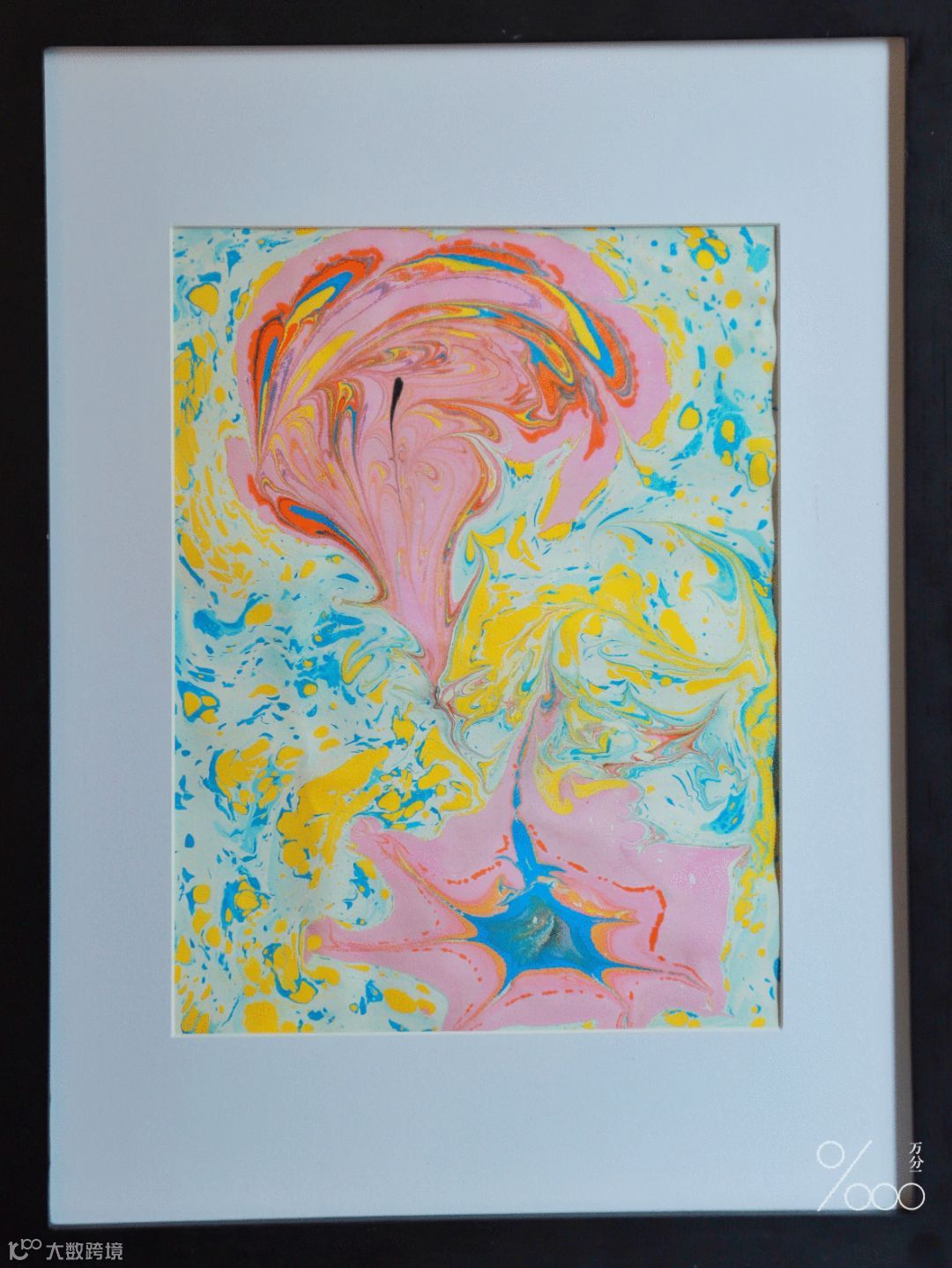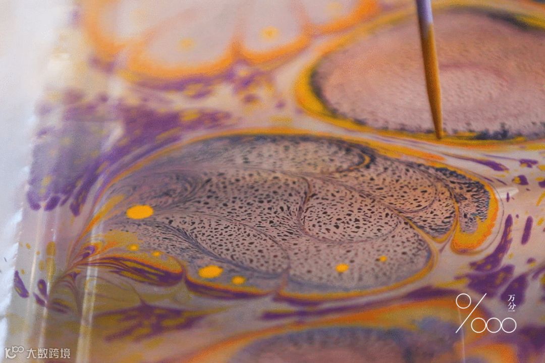 湿拓画,也称为大理石花纹纸艺术,是指用颜料在水面画出各式图纹的一种传统手艺。最早被用做《古兰经》封面的纹理布面,源于中国的“墨流”画法。