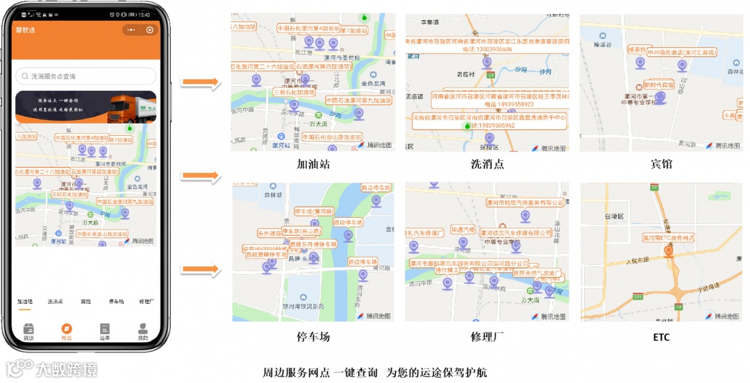 为了解决这一问题,慧牧通平台特别上线了“附近网点查询”功能,一键即可查询到你附近的洗车点、加油站、宾馆等服务网点。