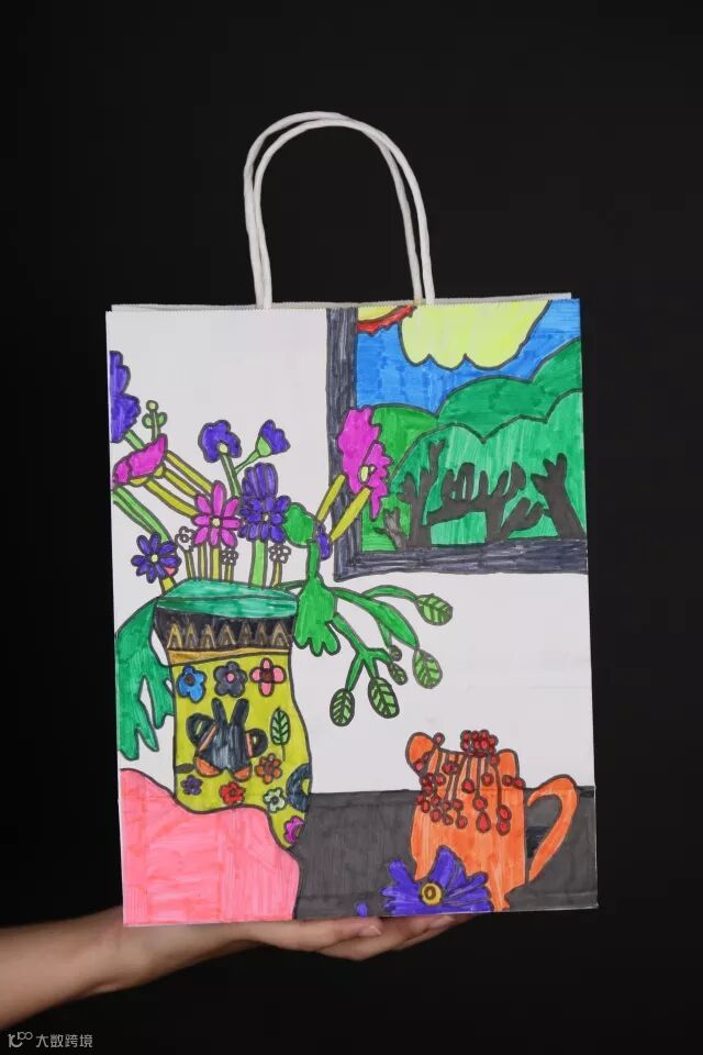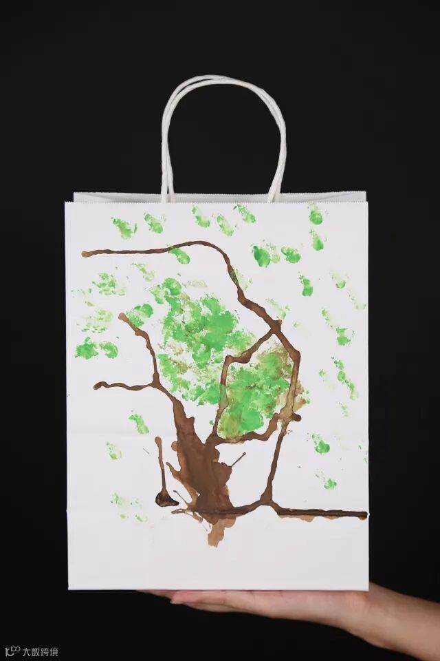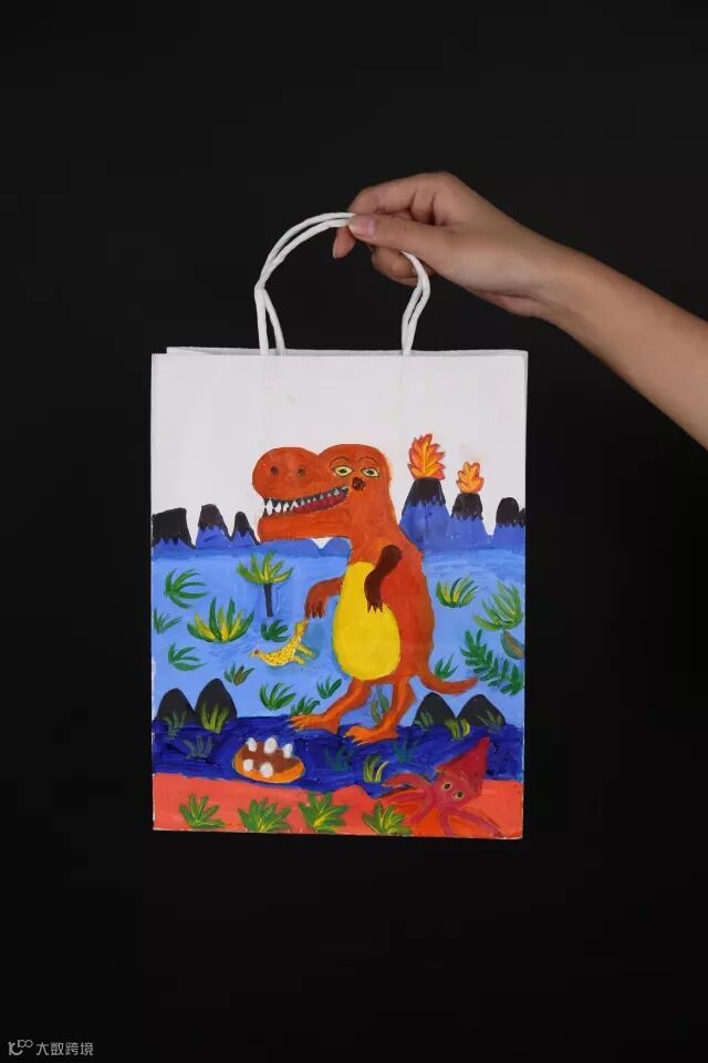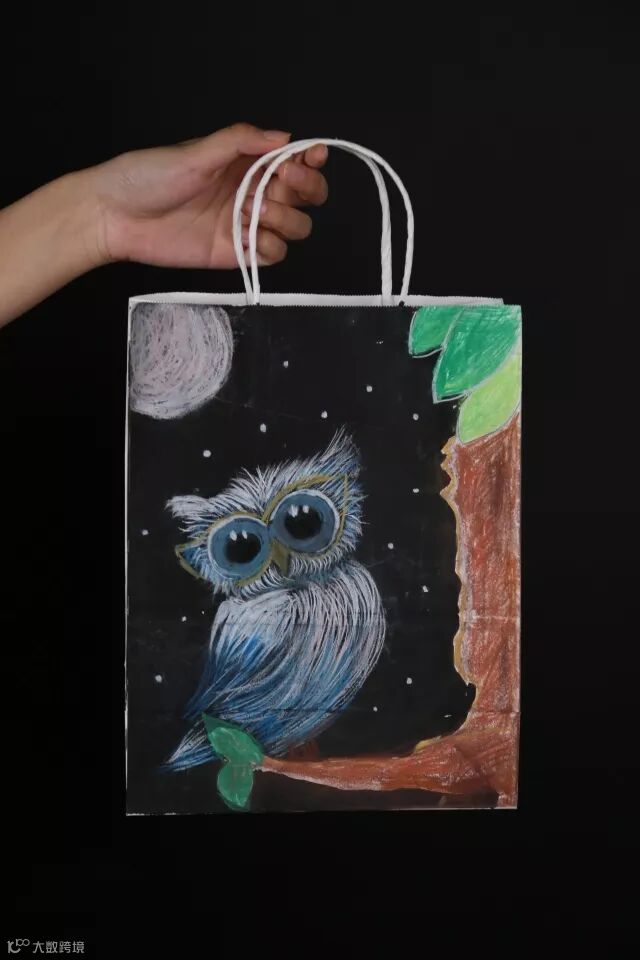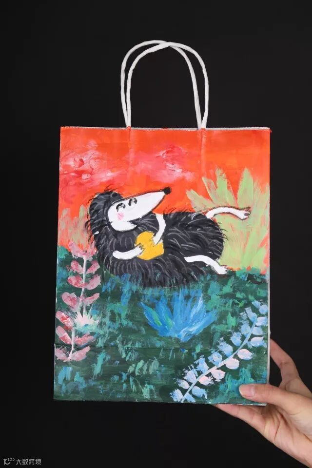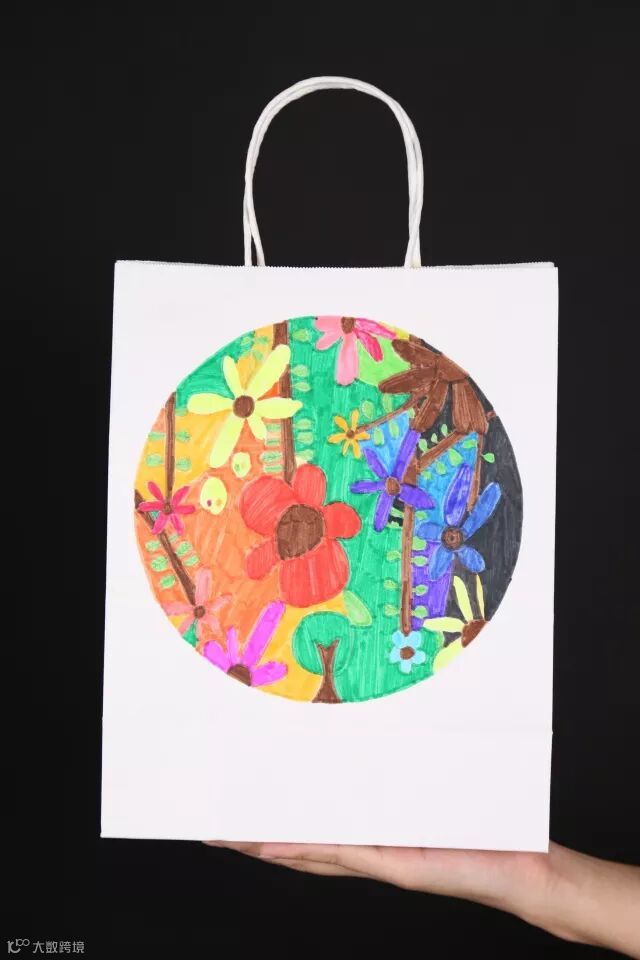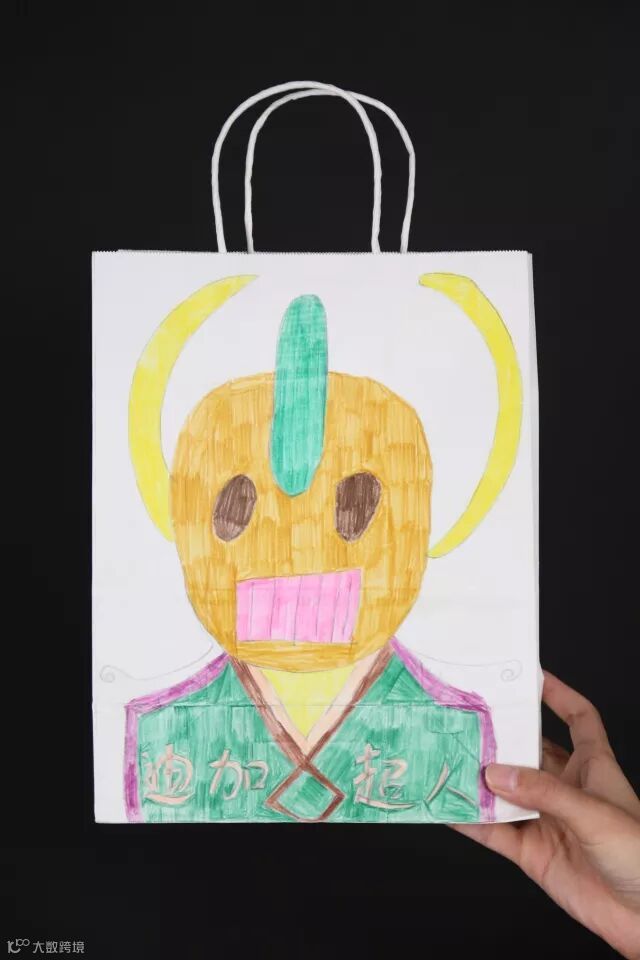 我们在“用什么形式来展示孩子们的创意”时产生过热烈的讨论,最终我们选择了一种最为简单环保的方式,在纸袋上作画。