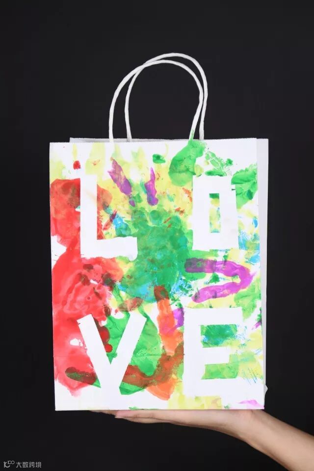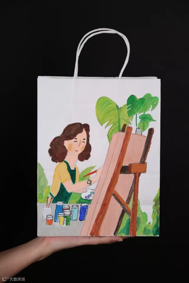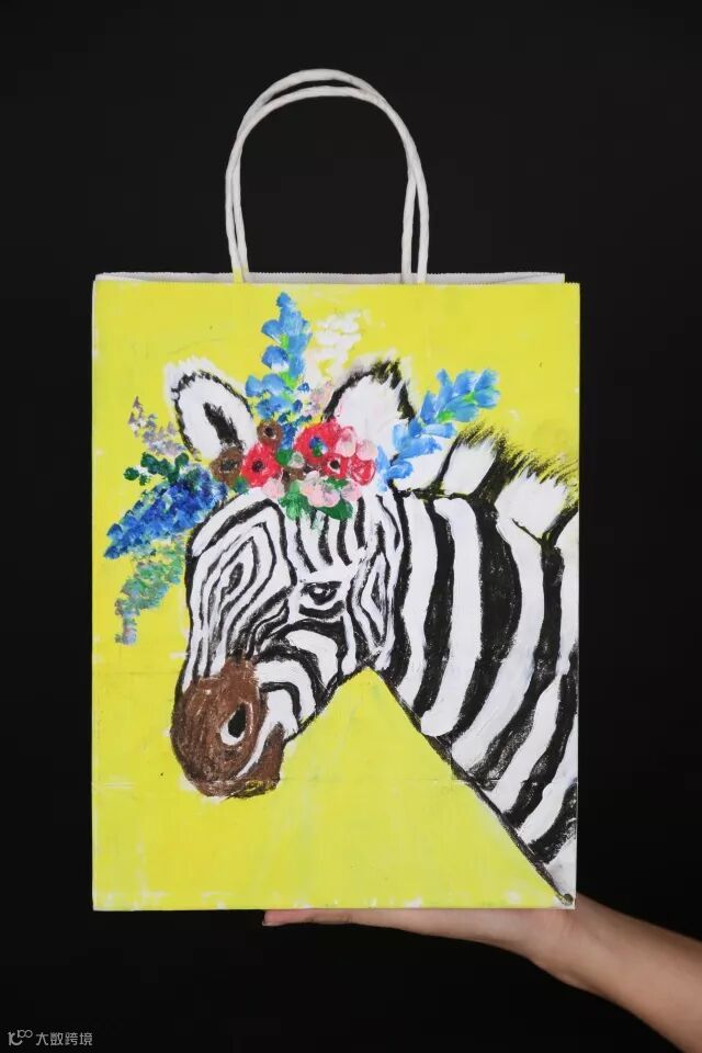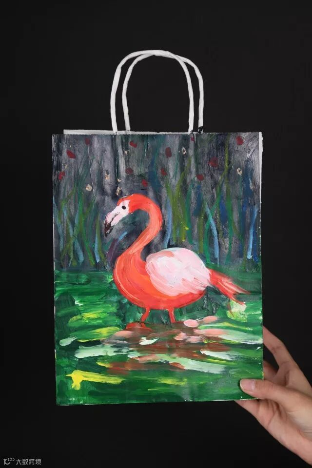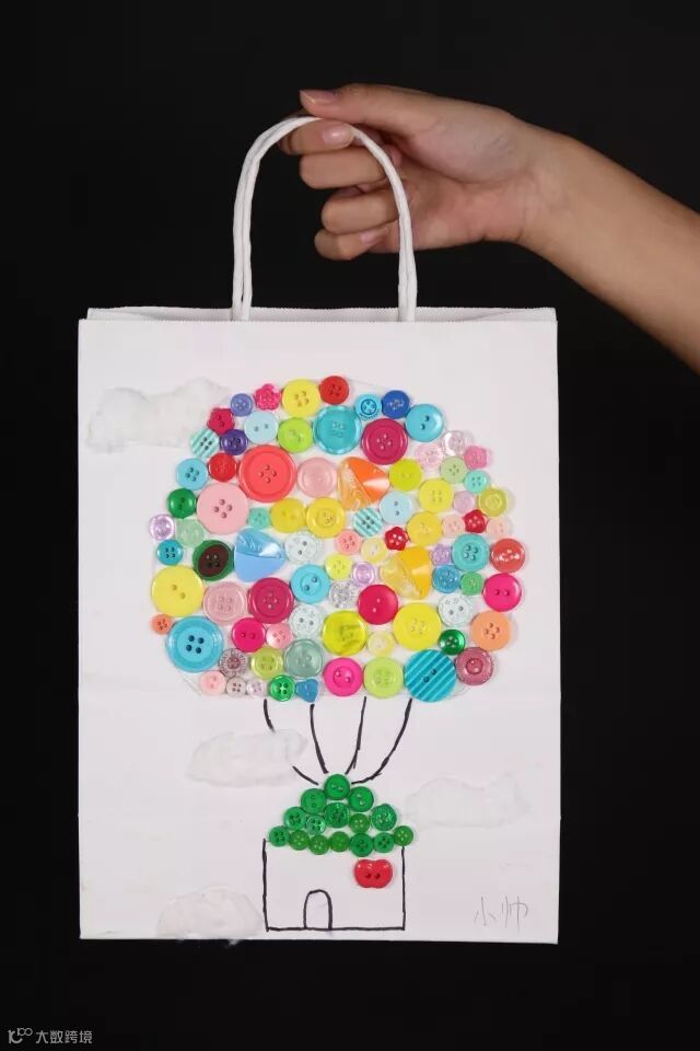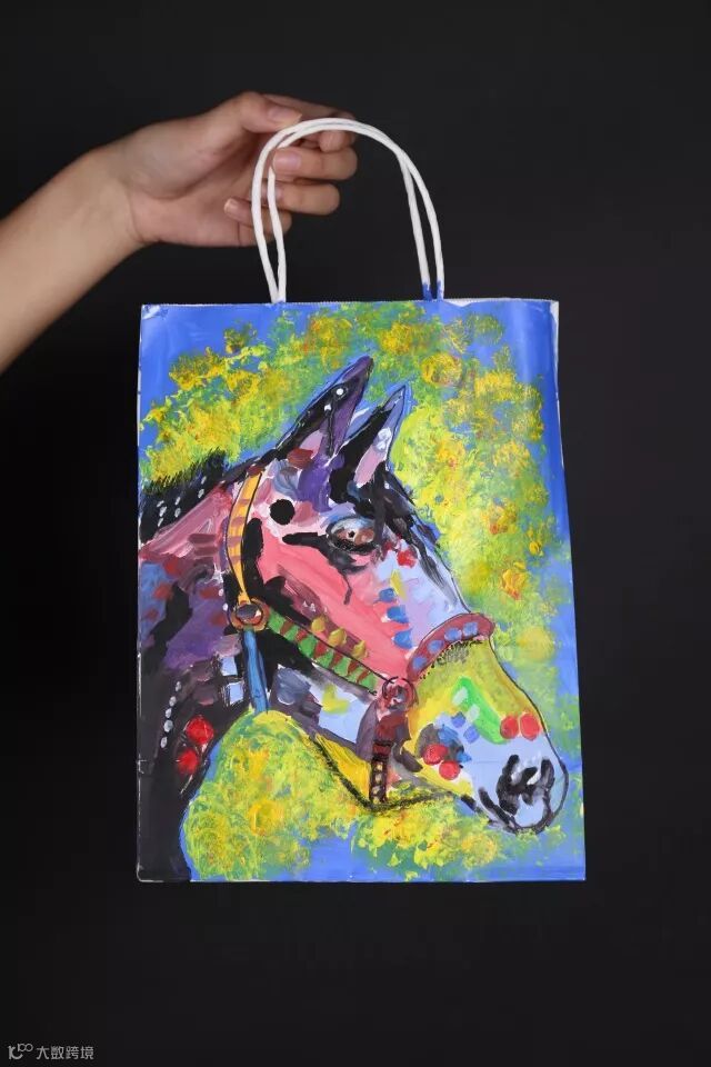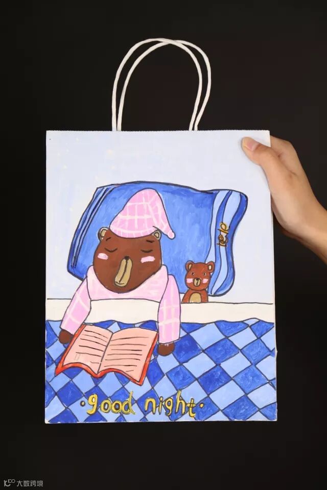我们在“用什么形式来展示孩子们的创意”时产生过热烈的讨论,最终我们选择了一种最为简单环保的方式,在纸袋上作画。