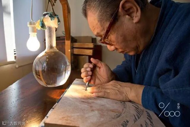 ▲已经从业50年以上的雕版师新实护允先生已经73岁高龄,雕版是一项极其细致的工作,因此对工作台周围的光线要求极高,木版上方的电灯下方悬挂著一个装满水的烧瓶。电灯光打在水上产生不规则反射,工作台上的影子便消失了,细腻的线条一根一根显现无遗。
