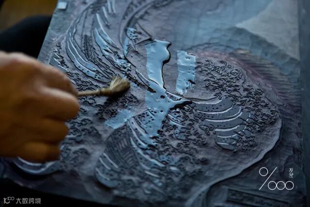 雕版师首先将用大米製作的「和浆糊」用手涂抹在木版上,然后在上面反著舖一张质地极薄的和纸画稿。从木版上方看,波浪是在右侧,印刷出来的纸上则是在左侧。