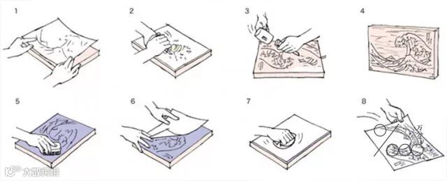 1、在木版上贴上画稿 2,用小刀雕刻出轮廓 3,用凿子凿出凹面 4,主版完成 5,为木版着色 6,铺纸 7,用马连摩擦 8,刷版完成,反复多次拓印色板。