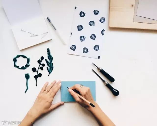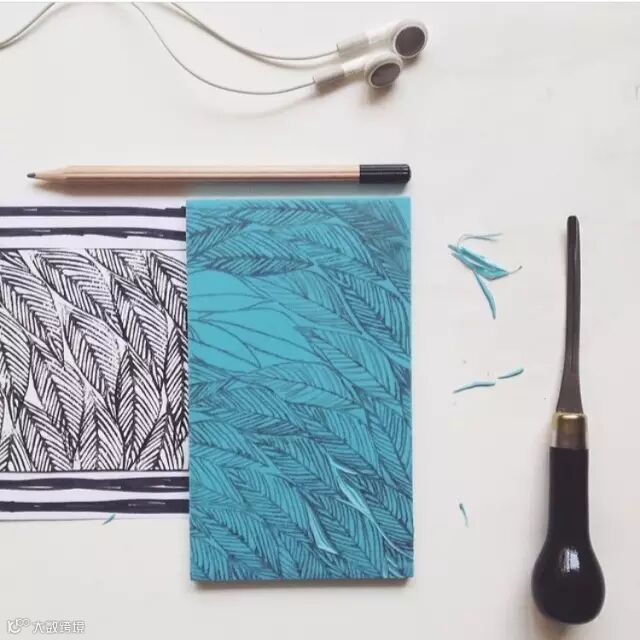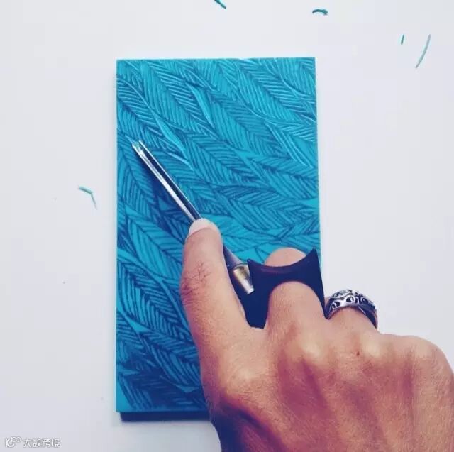 在橡皮上依照事先绘制的图案进行临摹和雕刻