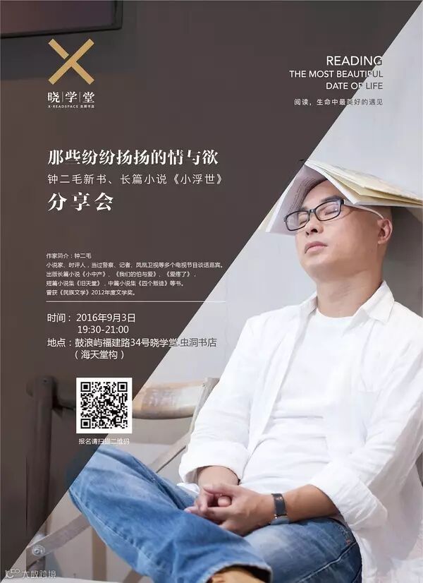 9月3日,他将带着新书《小浮世》来晓学堂·虫洞书店分享一场沙龙。谈谈他当警察和暗访记着的糗事,以及他是怎么莫名其妙走上写作这条“不归路”的?小说的奥妙到底是什么?《小浮世》被读者更名《啪啪啪》,又是什么鬼?或许还有其他从他脑子里偶然蹦出来的话题。