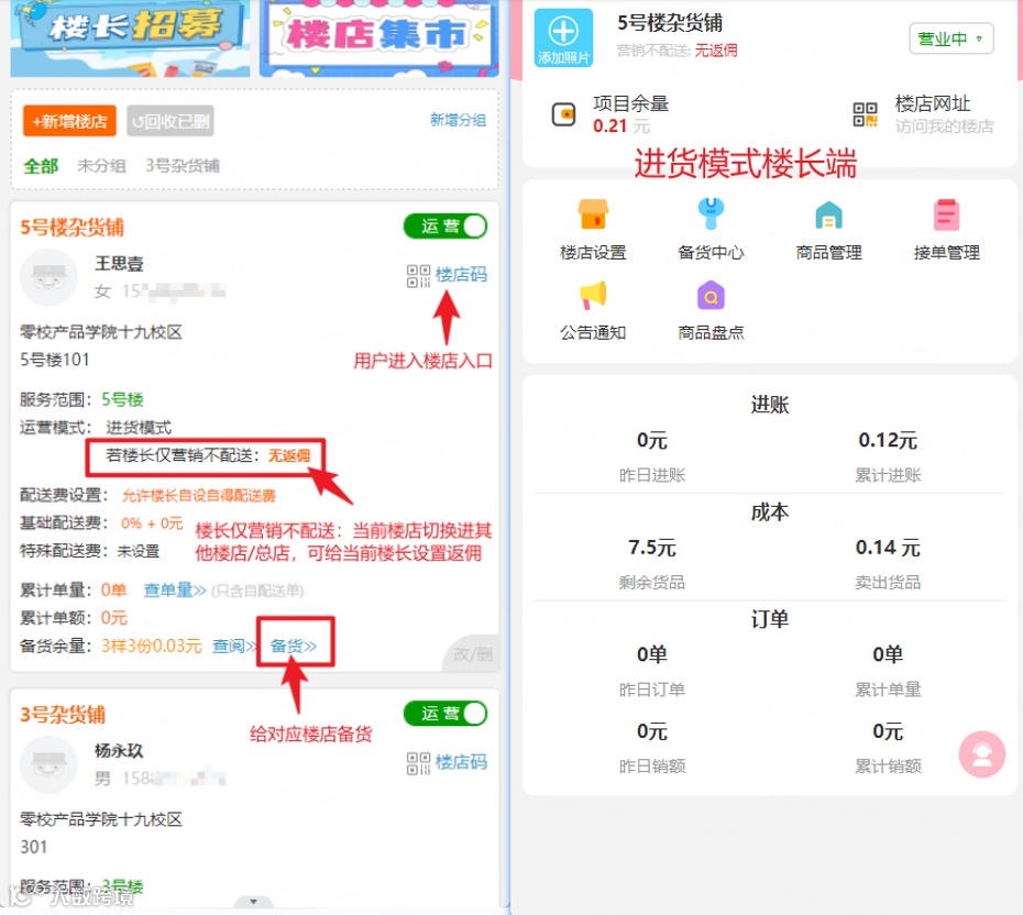 每栋宿舍楼招募1-2名楼长,负责本栋楼的推广、接单和配送。