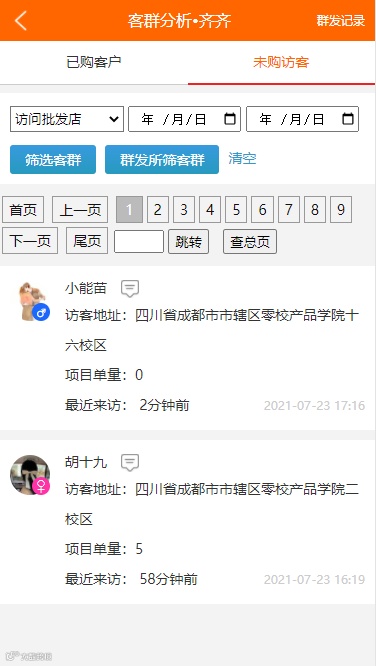批发店-客群管理未购访客展示信息增加省市区校、项目单量等信息展示,同时对其访问时间进行细化。