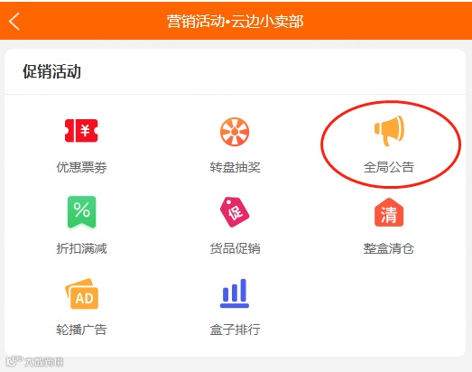 全局公告:利用系统自带的营销活动-全局公告,用户扫码下单时就能看到公告内容参与到招募楼长的活动中。